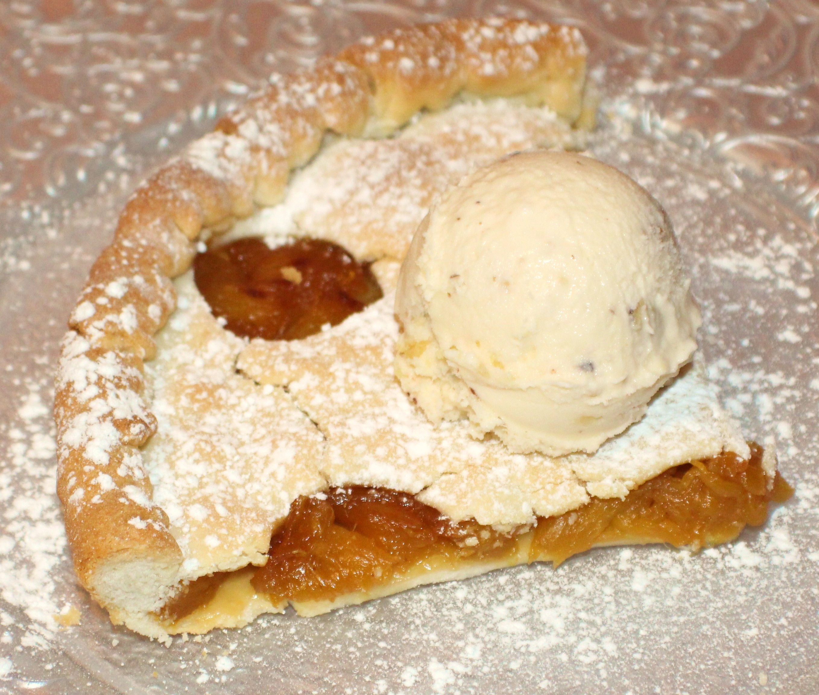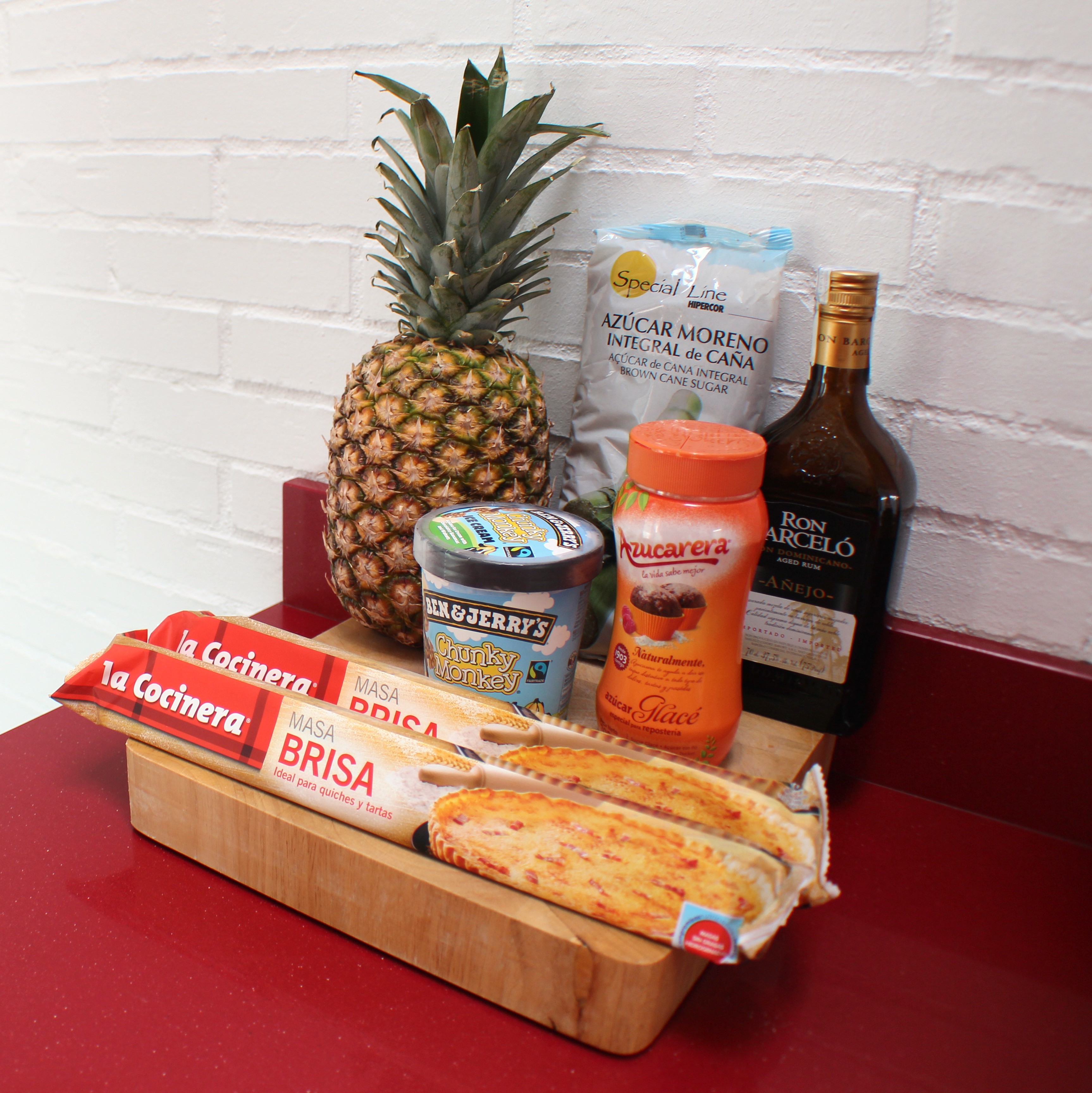 2 planchas de masa quebrada, 1 piña natural, 3 cucharadas de azúcar moreno, un buen chorro de ron tostado, mantequilla, azúcar glass y helado al gusto.