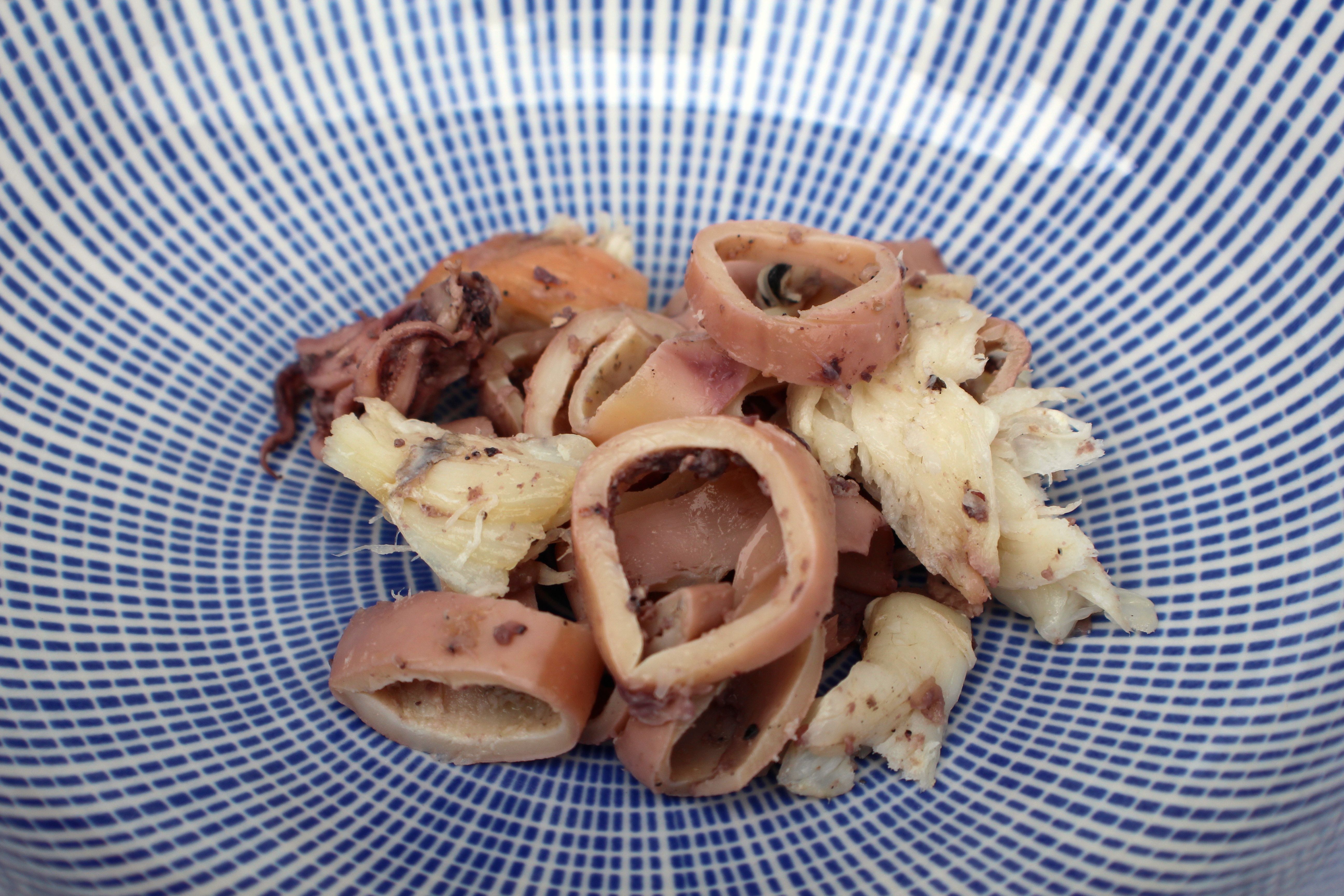 El resultado es bueno, el gazpacho no deja de ser una ensalada líquida y casi cualquier tropezón tiene cabida. En este caso he utilizado los restos de la cocción del fumet que había preparado para el arroz meloso de chipirones y ahumado de Pría. En mi cocina no se tira nada y como se suele decir por aquí «lo que no afuega, engorda» (lo que no te ahoga, engorda).