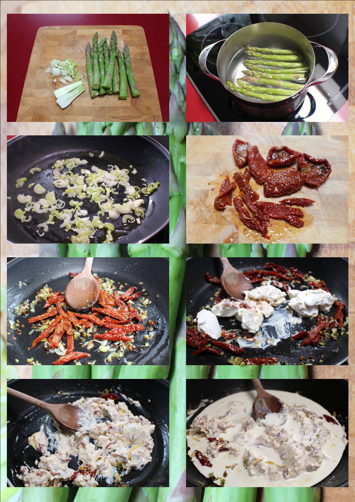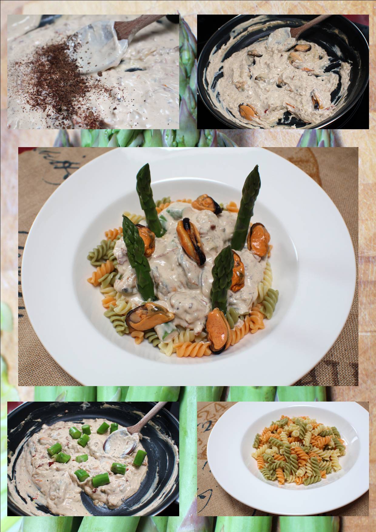200grs. de pasta, 200grs de nata, 100grs de queso Philadelphia, 75grs de tomates secos en aceite, 100grs de mejillones, espárragos trigueros, 2 cebolletas, aceite de oliva virgen extra, sal y pimienta de Jamaica.
