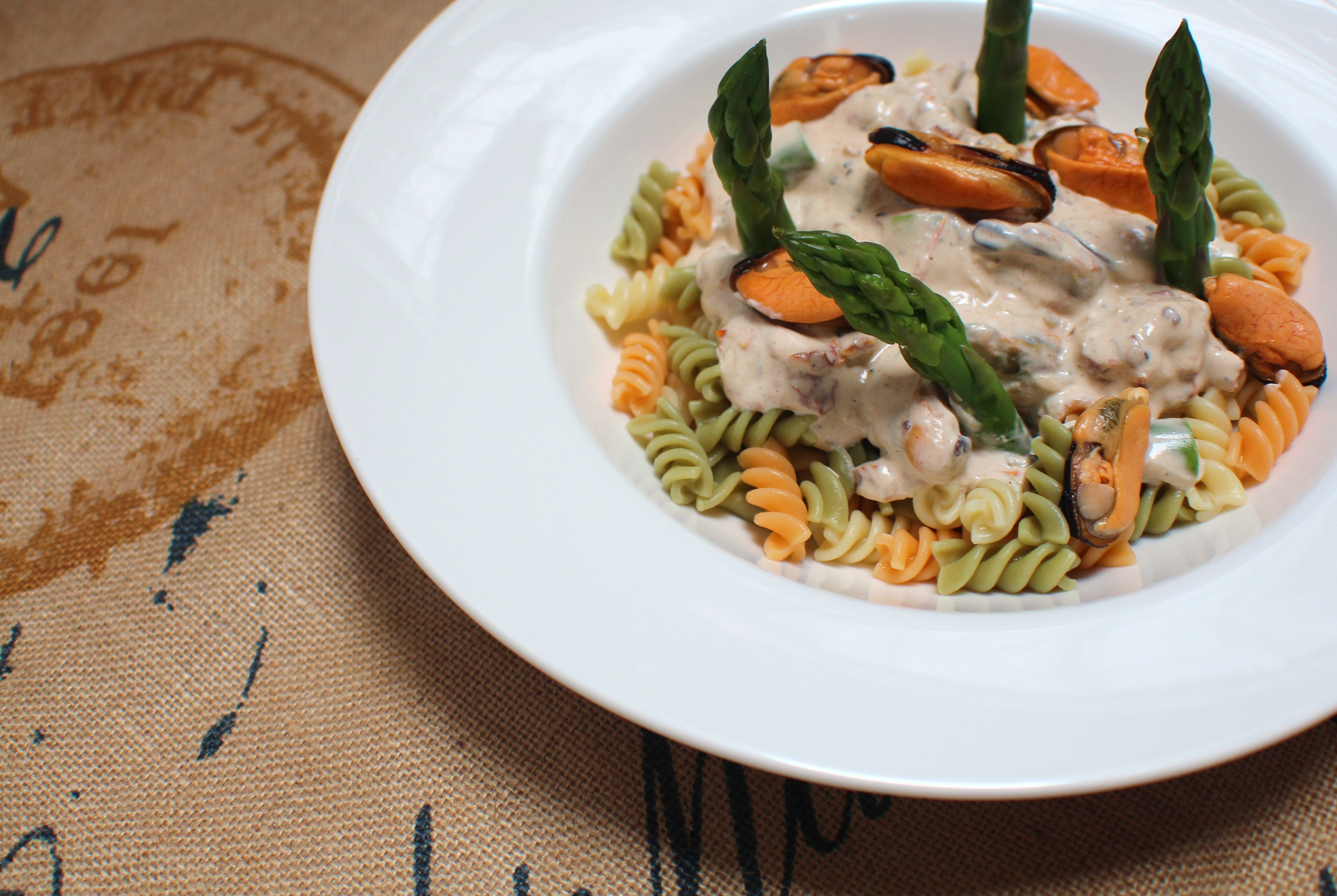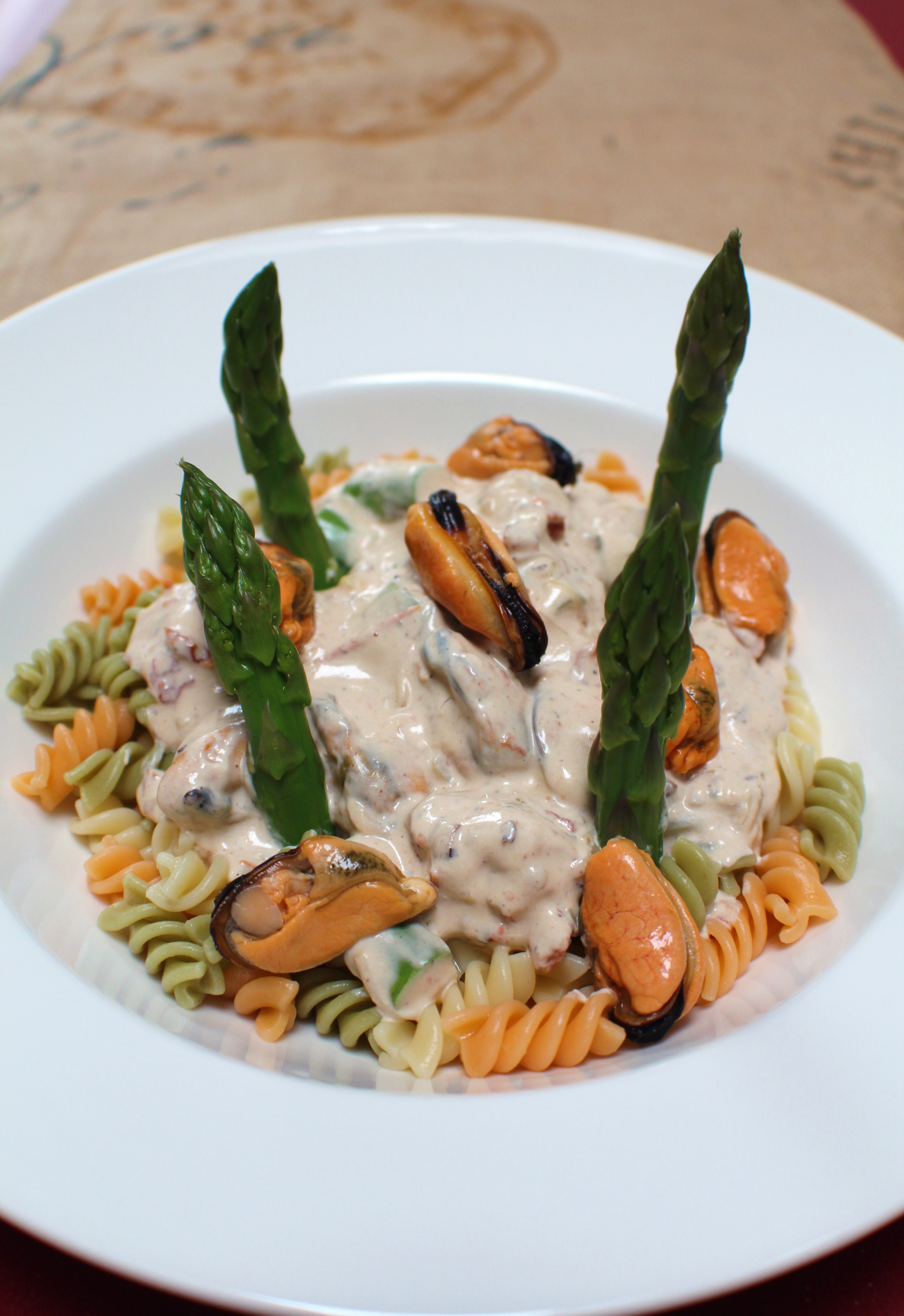 Tenía claro que debía utilizar unos mejillones y el tomate seco que tenía guardado. Con esta base solo era pensar un poco, realmente el tipo de pasta me daba igual. Al final escogí la tricolore porque me pareció más visual. Los espárragos trigueros aparecieron sin pensarlo, un simple vistazo a los productos que nuestro supermercado nos ofrece.