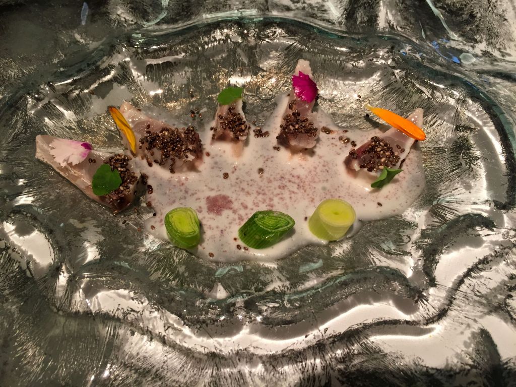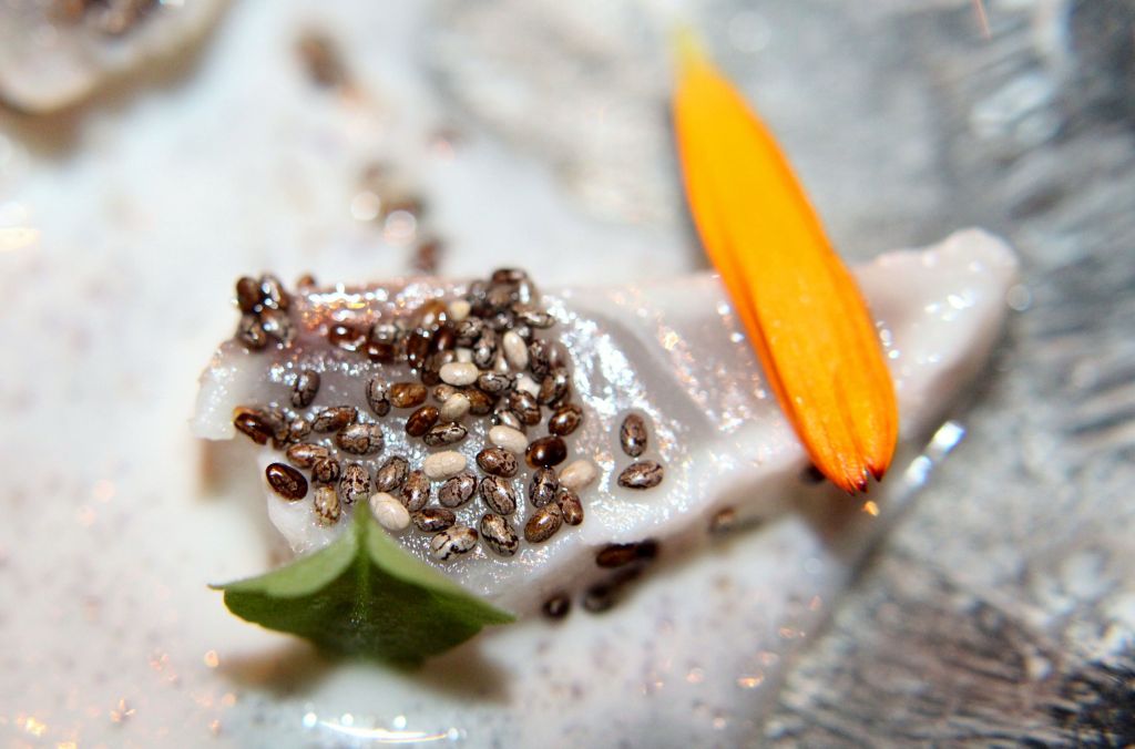 Seguimos con el pescado del día, en este caso una erla (herrera) marinada en patxaran con polvo de maíz morado, semillas de chía y ajo blanco.