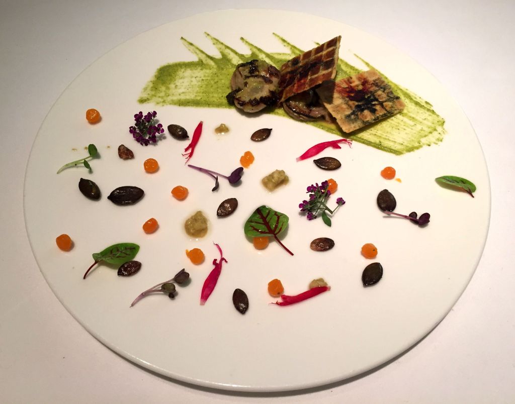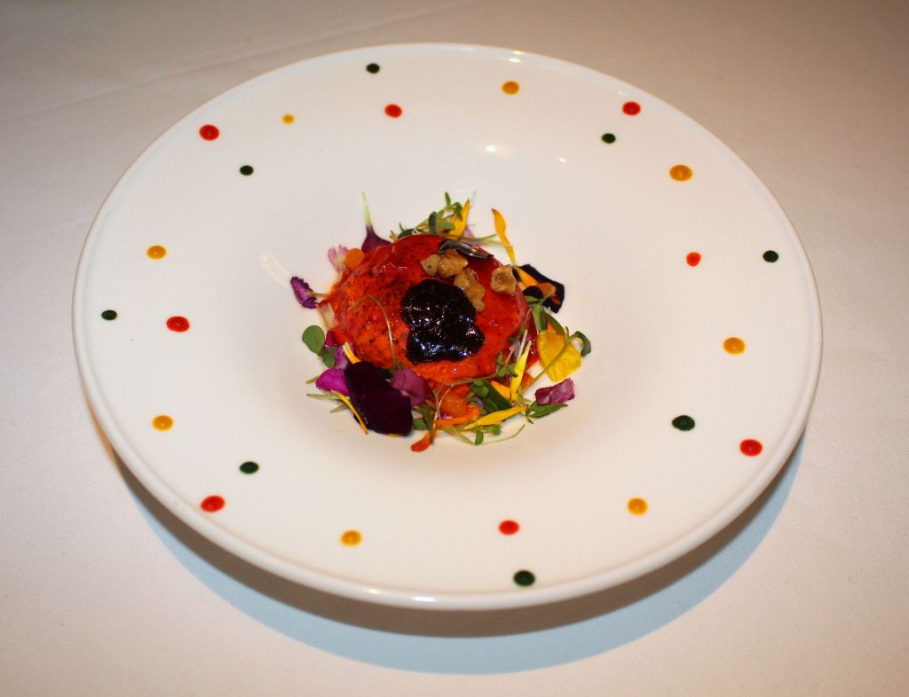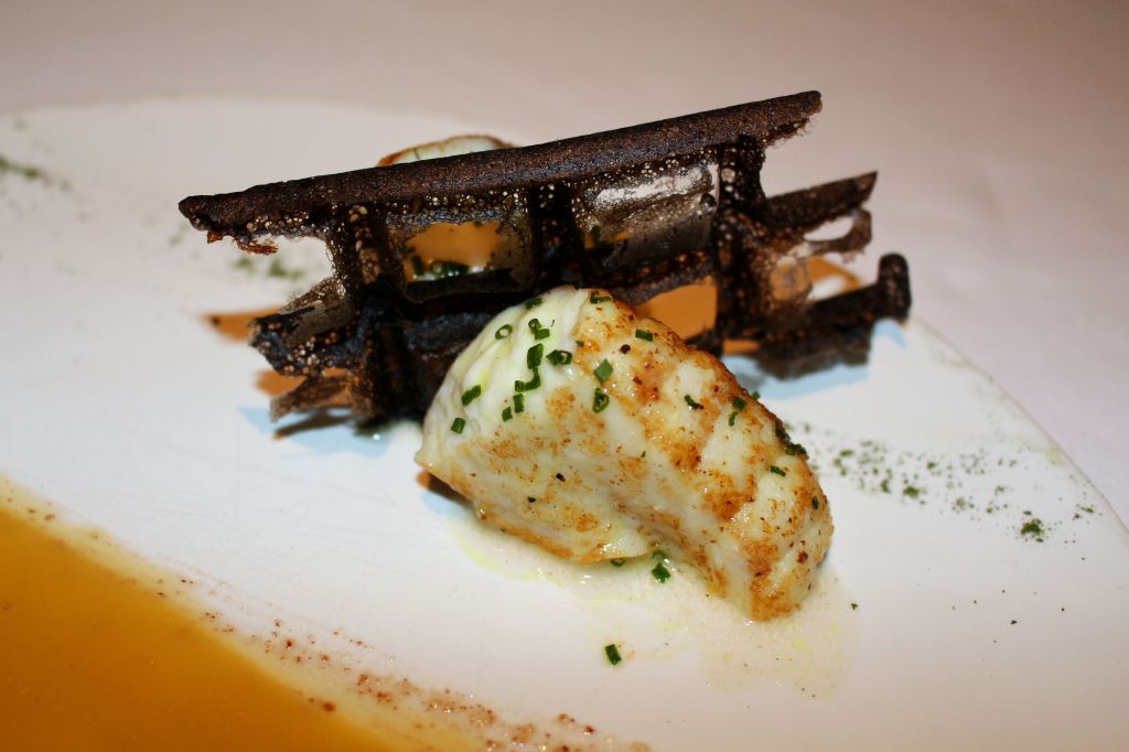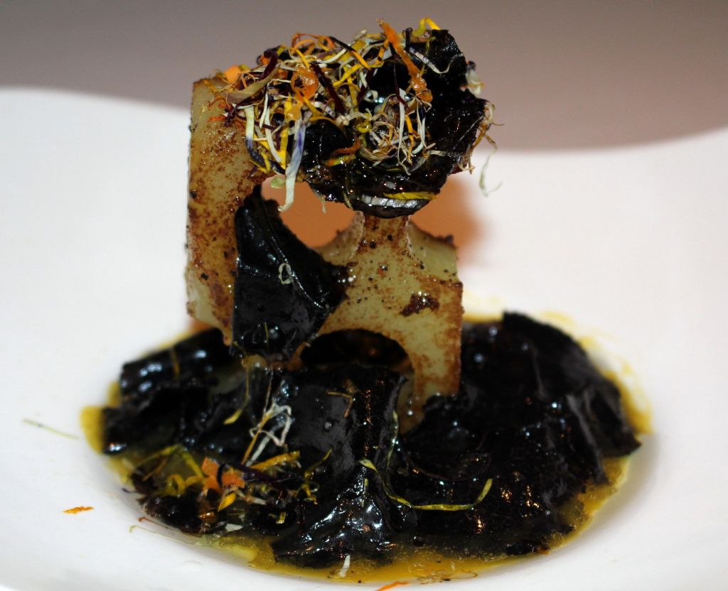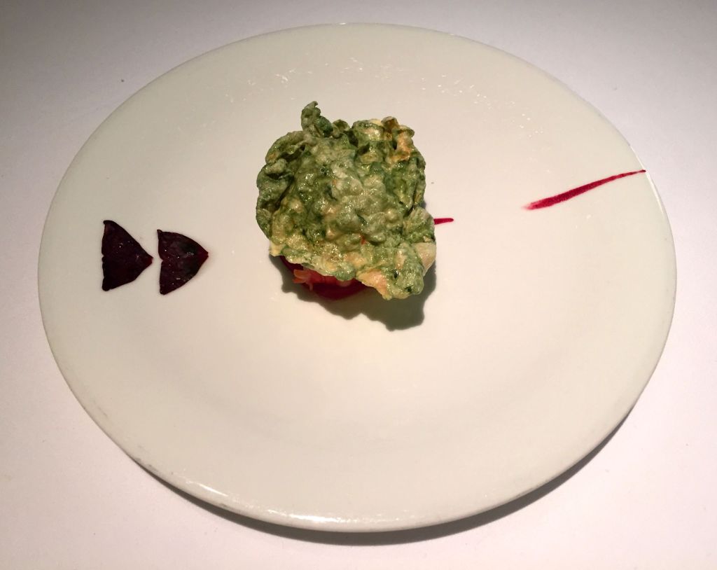 El siguiente, por su colorido fue quizás el plato que más me gustó visualmente y a nivel gustativo cuando la yema desparrama y mezclamos, este huevo rojo espacial alcanza su esplendor. Un huevo «rojo cocido a 65º, pimientos rojos, fermentos de cerales y manitas crujientes.