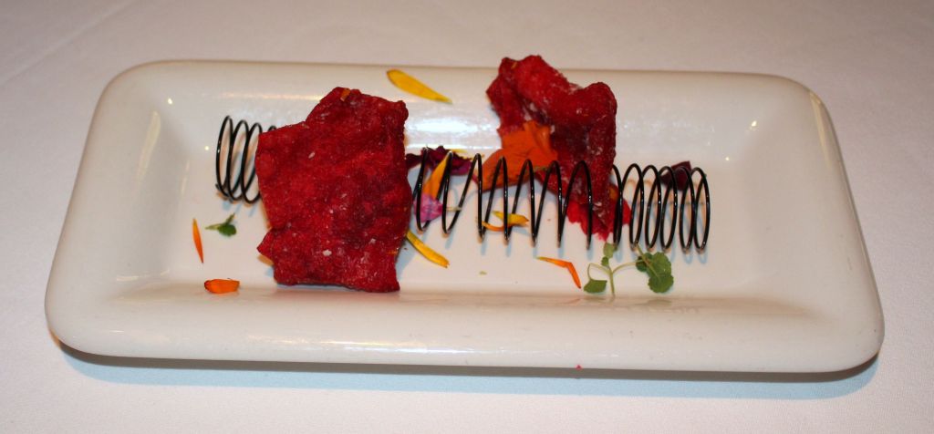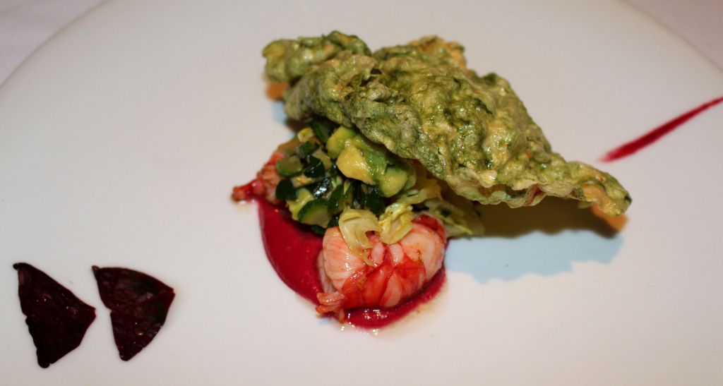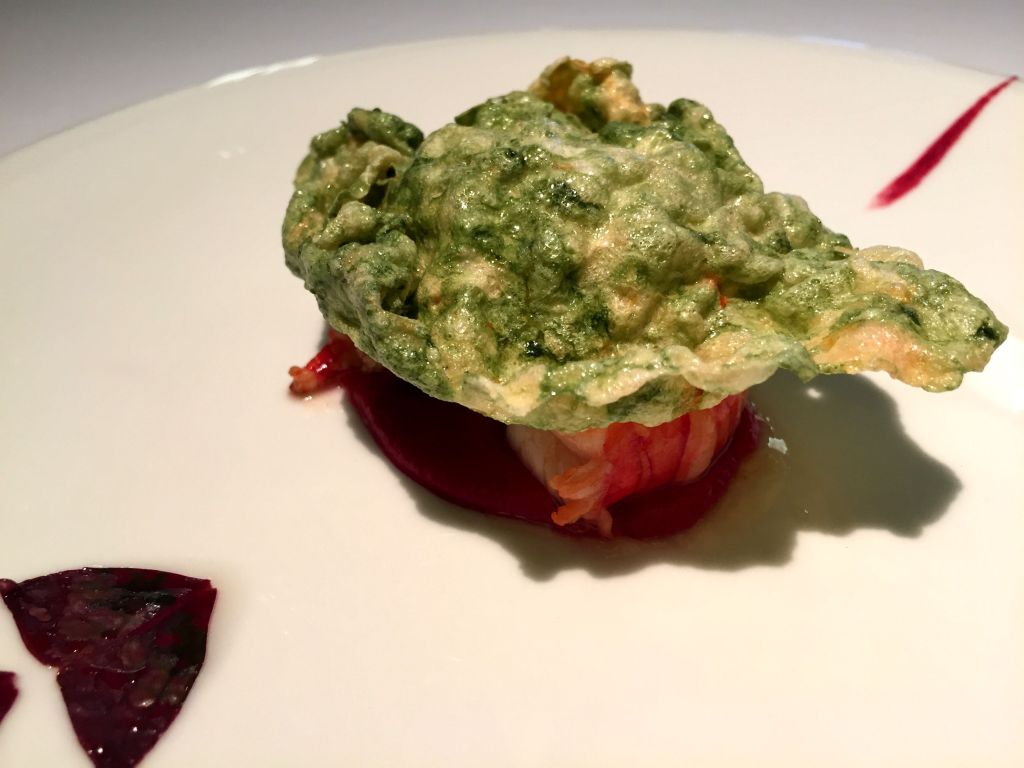 Continuamos con unos carabineros marinados en hierba limón y menta, acompañados de un preparado untuoso de remolacha y crujiente de krill.