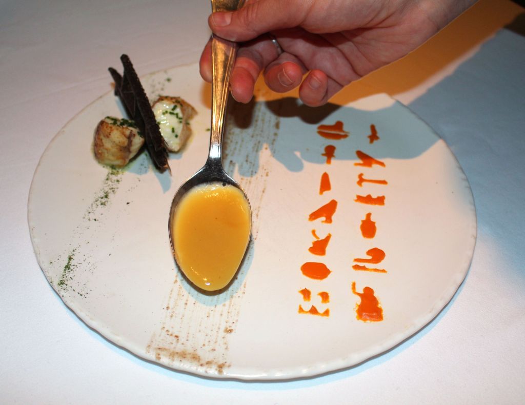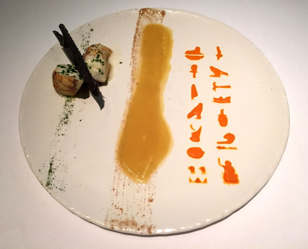 El nombre del plato es Rape Cleopatra y se compone de unos lomos de rape asado junto a un mojo de nuez pecana y formas jeroglíficas de calabaza y garbanzo.
