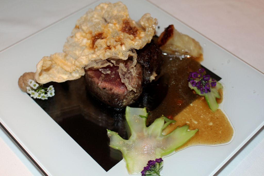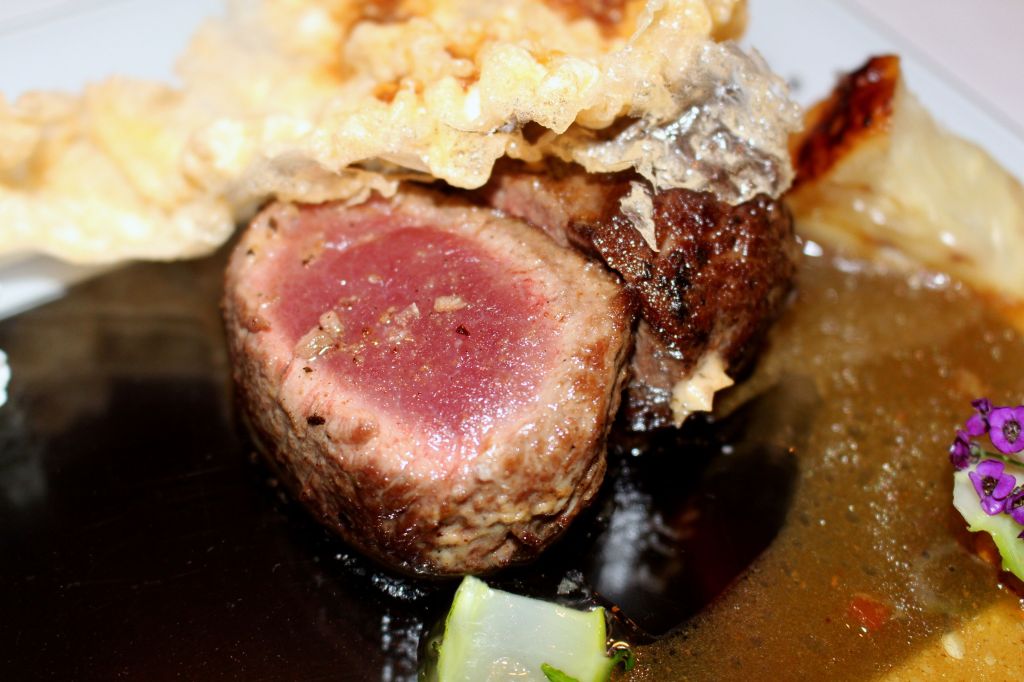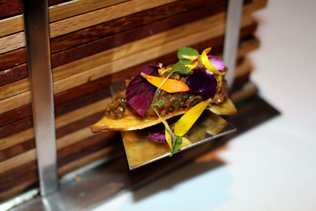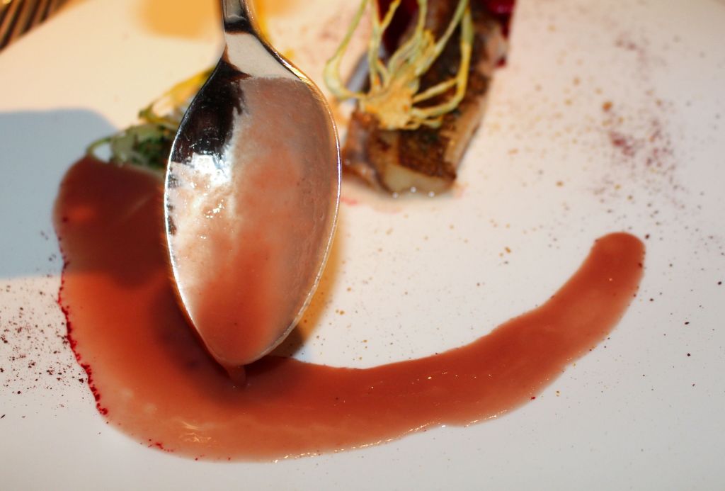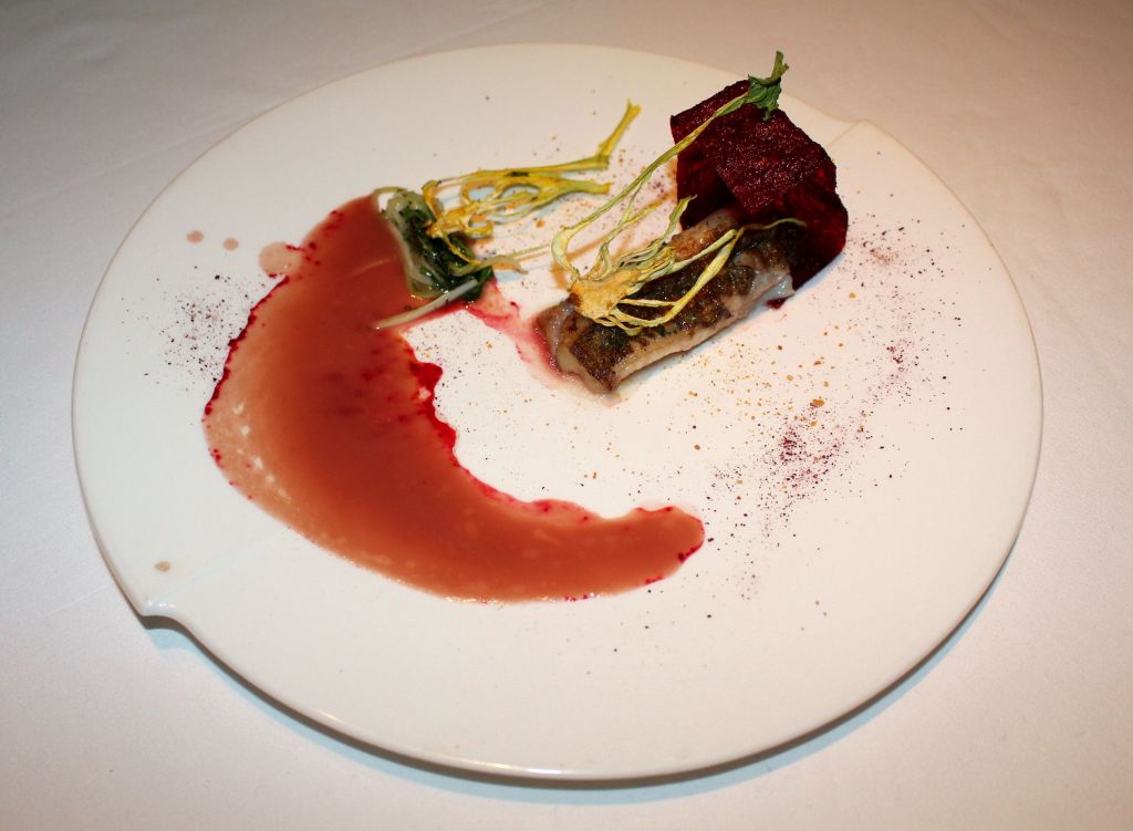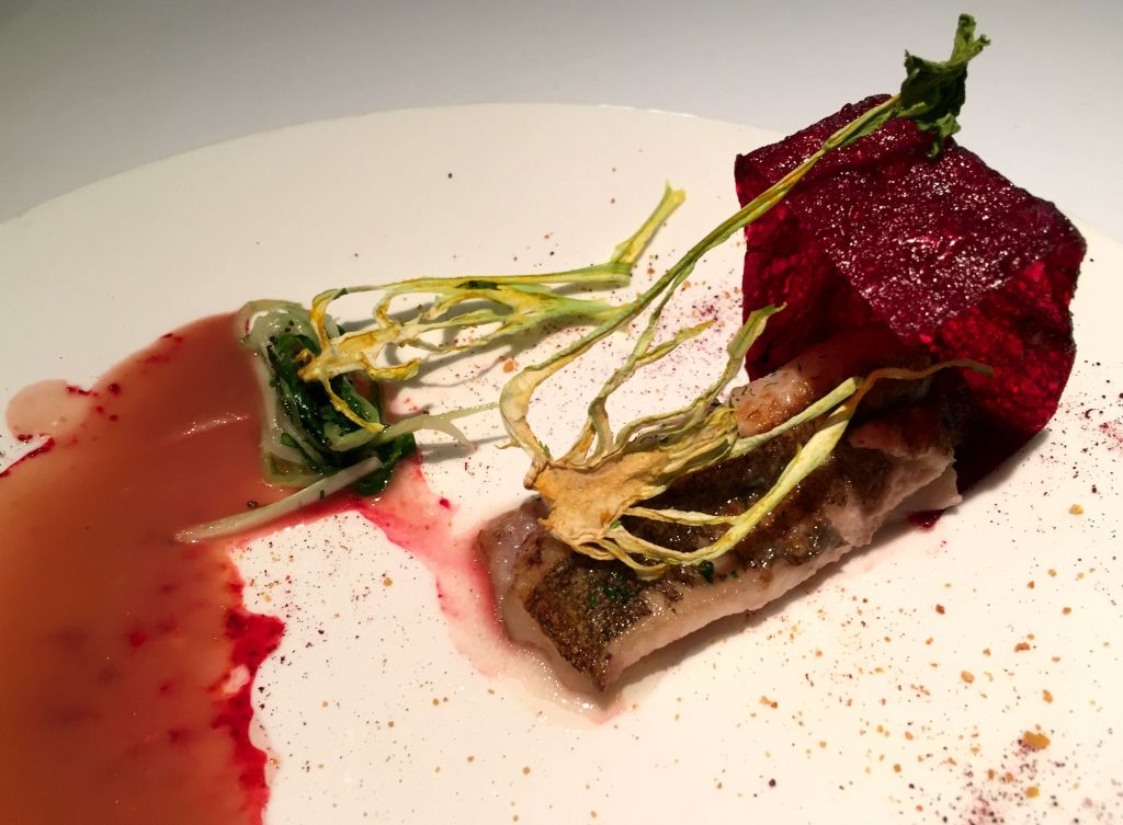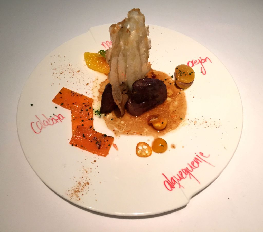 Si hablo del que más me gustó estéticamente, es justo mencionar el que menos. El lenguado en caja roja es muy llamativo pero cuando sirven la salsa de hibiscus a pesar del bonito color, la imagen se ensucia bastante. Ahora bien, los sabores del lenguado con cubo de remolacha y obulato, pak choi y toques de arenga, son fabulosos.
