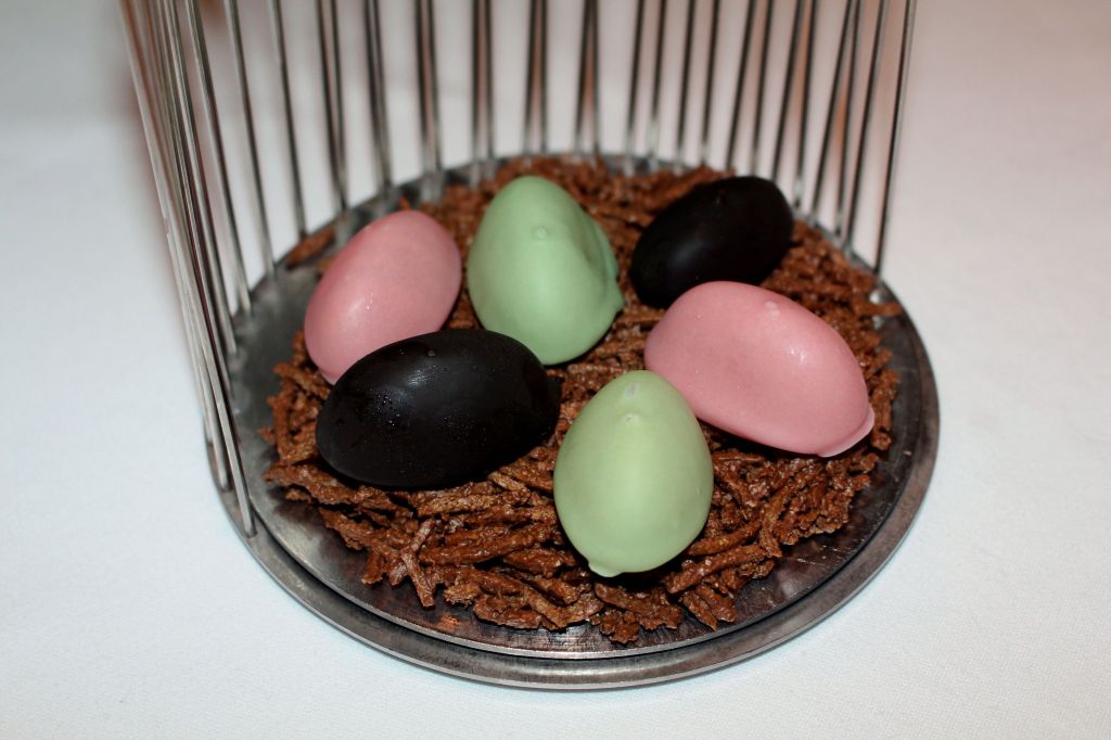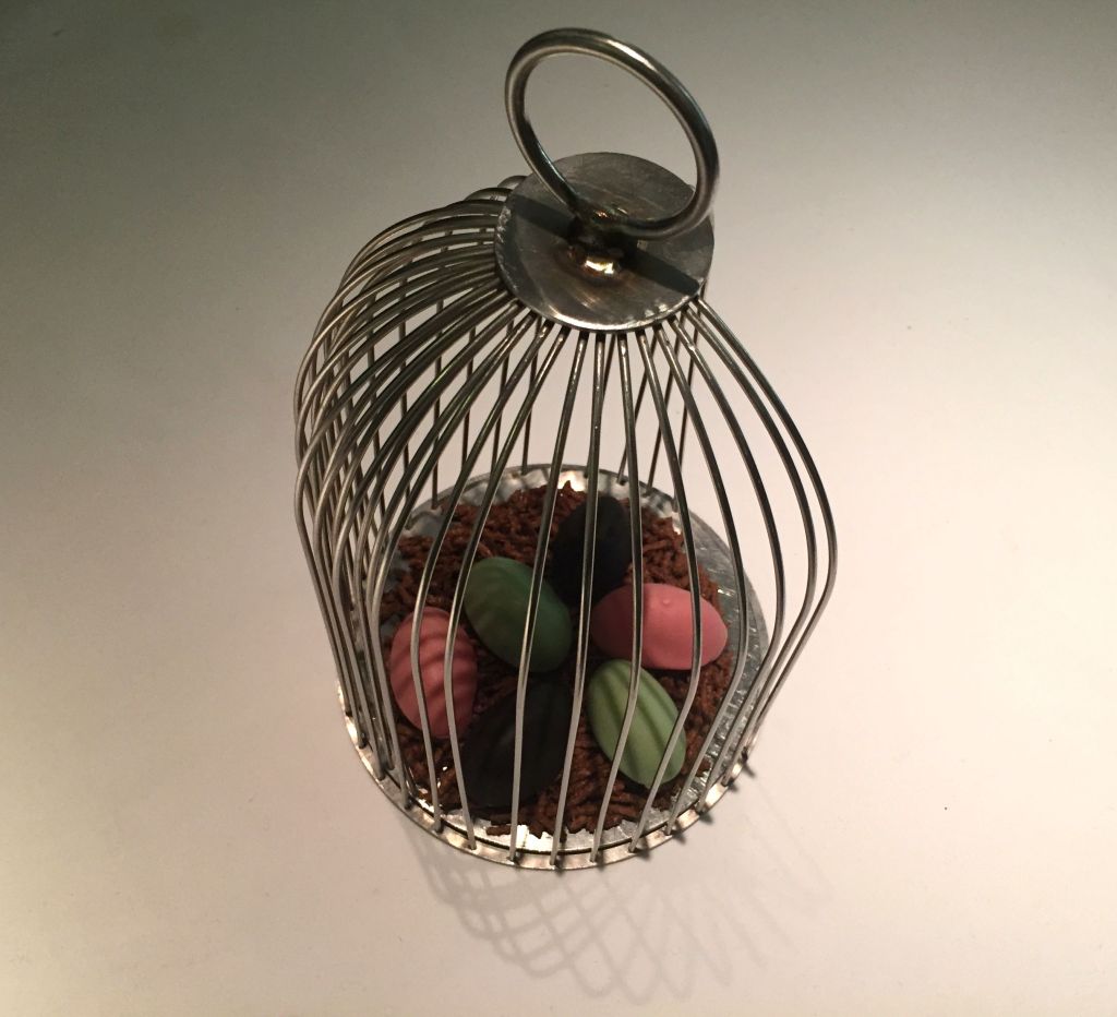 Ahora si, finiquitamos con los petit fours. La jaula de grillos, se compone de unos bombones líquidos. El negro es de jengibre y lima, el rosa de menta y fruta de la pasión y el verde de manzana.