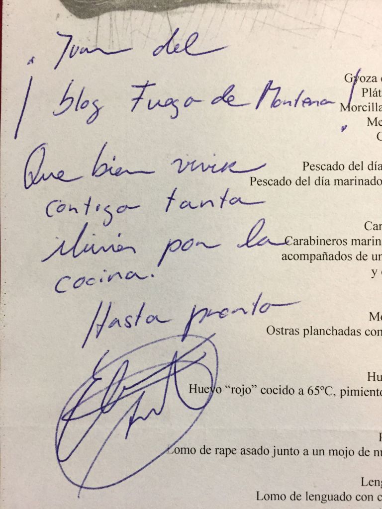 La experiencia no pudo tener mejor broche de despedida, Elena volvió a salir a dedicarnos parte de su valioso tiempo, comentamos y cambiamos impresiones sobre el menú y mi pasión por la cocina. Le pedí que me firmara el menú y estas son sus sentidas palabras rubricadas, ahora se lo que sienten los grandes toreros cuando salen a hombros por la puerta grande de la Maestranza.