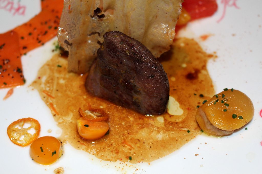 Turno de las carnes, un pato azulón anaranjado que está asado con sake y acompañado de alquenjenjes, mandarinas, naranjas, calabaza, orejones y crujiente de cebolla.