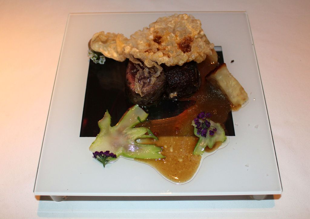 Seguimos con un plato de original mezcla de sabores, un corzo y ciervo marinero. Lo presentan con una tableta que tiene un clip con el movimiento de unas llamas y sobre ella disponen un plato de vidrio transparente con lomo de corzo y ciervo (dos sabores y texturas diferentes) asado con anchoas, teff, apionabo y tallos de brócoli.