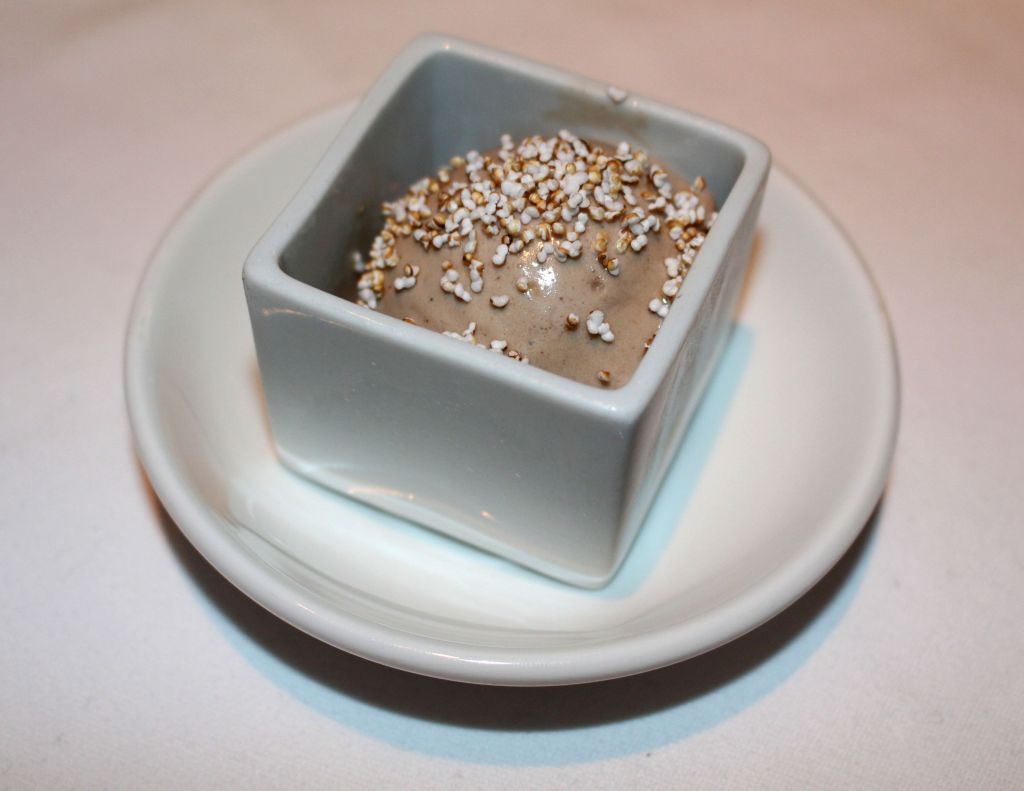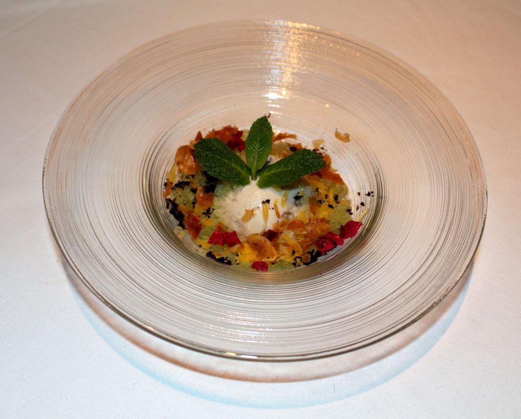 Tras habernos refrescado pasamos a la contundencia de los chocolates. La luna cuadrada es un cubo de chocolate «lunar» con interior fluido de menta, neroli y kiwi sobre el que se vierte una sopa cítrica y acompaña de un helado de amla, una grosella de la India.