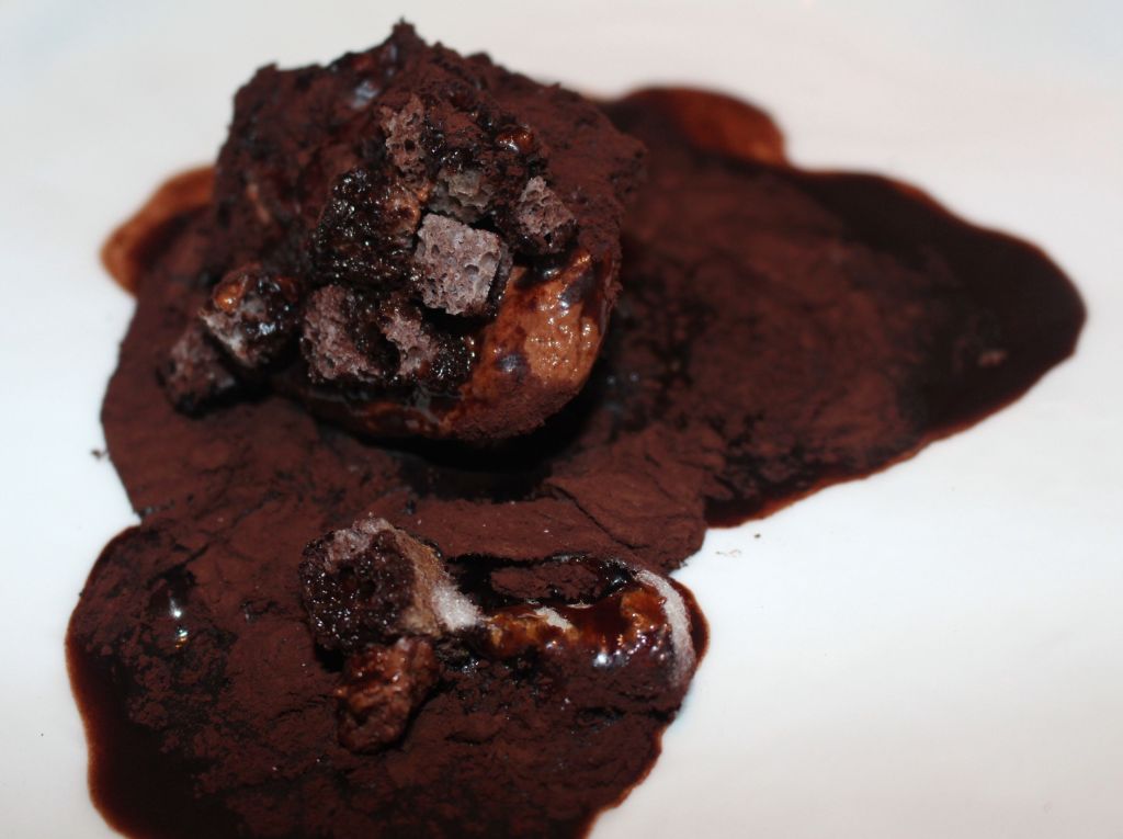 Por último, el trufón de chocolate. Se trata de una trufa voluminosa de cacao y algodón de azúcar que guarda en su interior un cremoso de chocolate y algarroba. Se acompaña para contrastar temperaturas con un helado de piña. En el vídeo podéis ver como al verter el chocolate caliente deja al descubierto su interior.