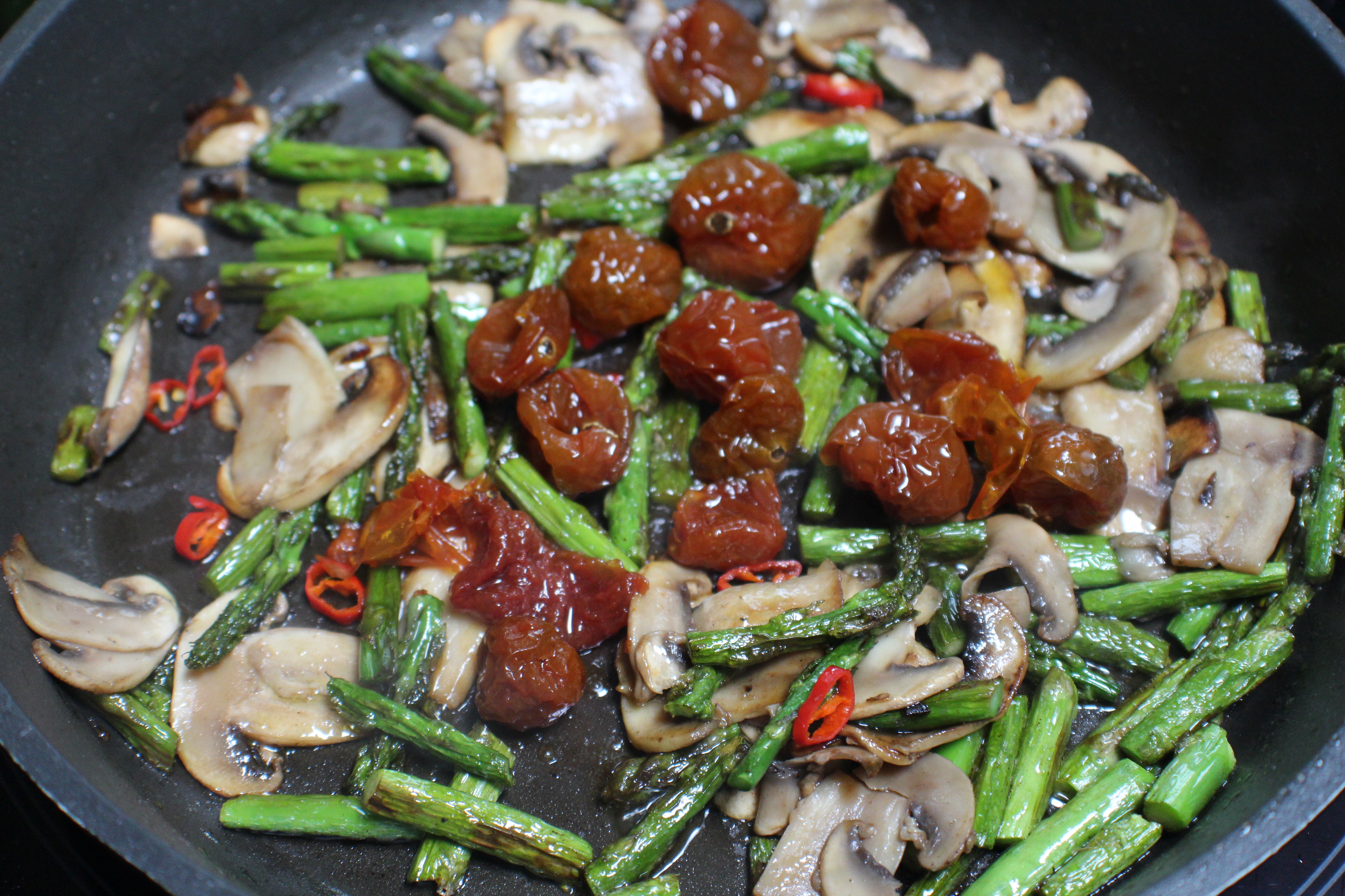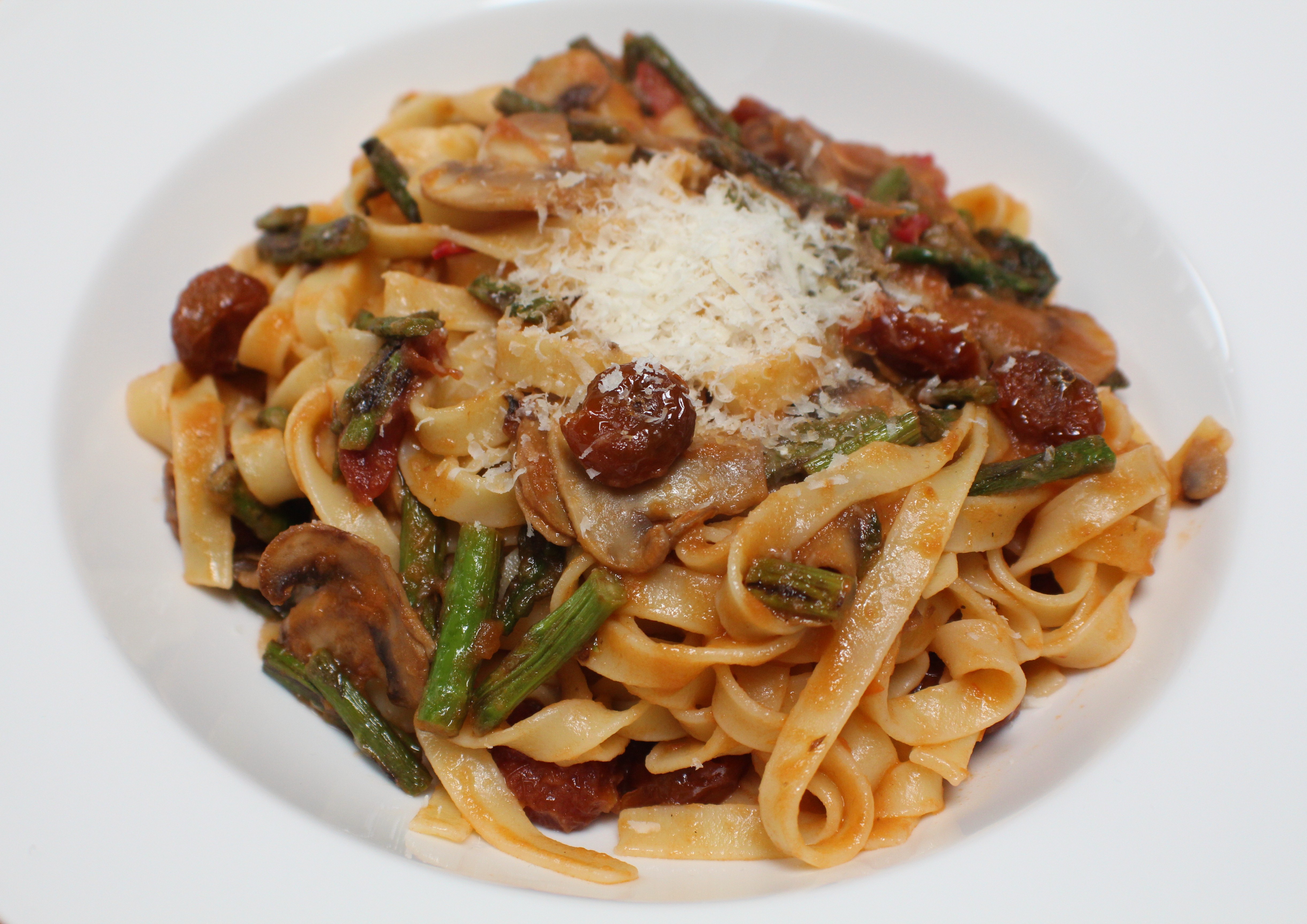 200grs de tagliatelle, 1 manojo de espárragos trigueros, 6 champiñones naturales, tomates cherry confitados, 150grs de salsa de tomate casero, 1 chile, un chorrito de vino tinto, aceite de oliva virgen extra, parmesano reggiano, sal y agua.