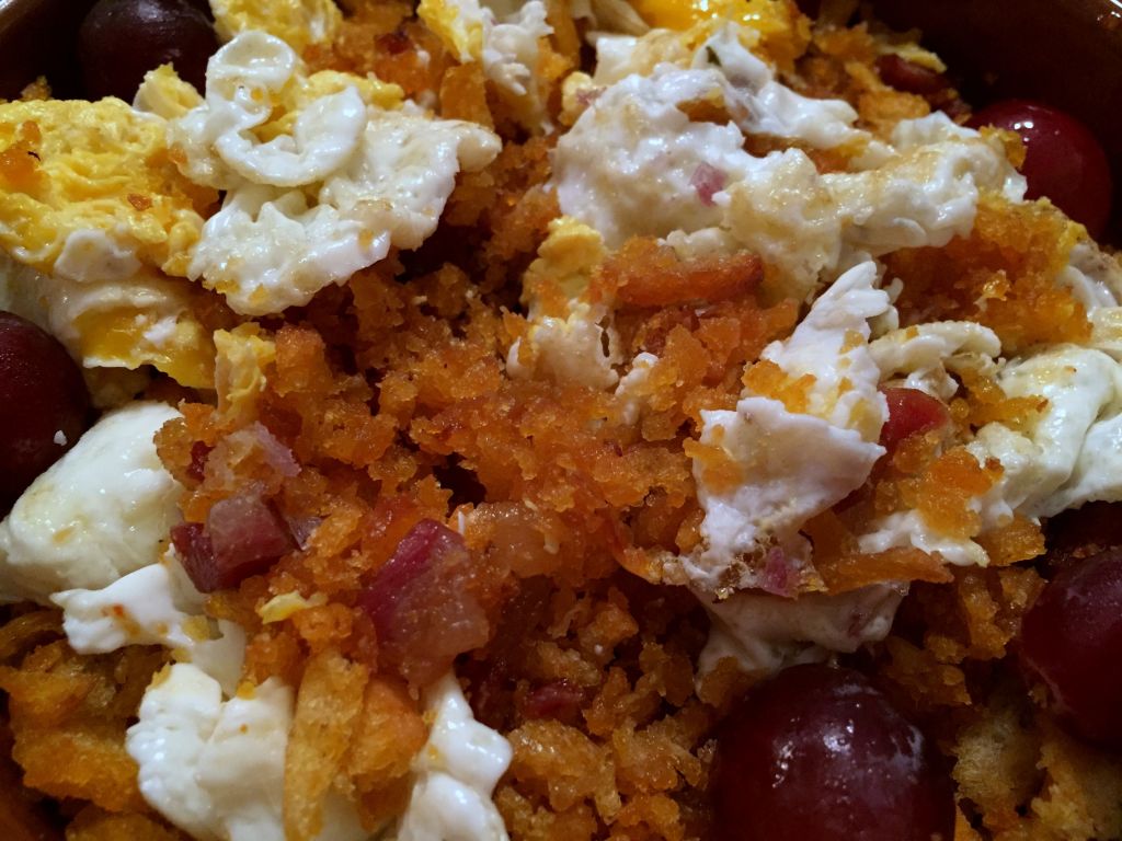 Turno de las migas bardeneras con huevos camperos y uvas, sorprendente combinación que suaviza las grasas.