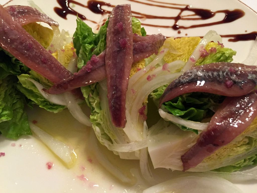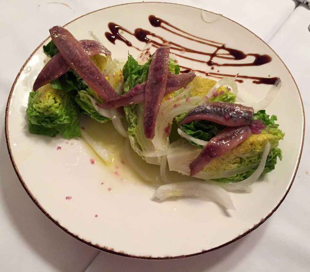 Rebajamos el tono con unos cogollos de Lodosa, emulsión de AOVE y anchoas de Santoña.