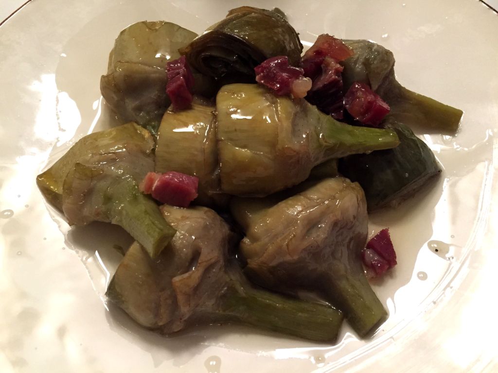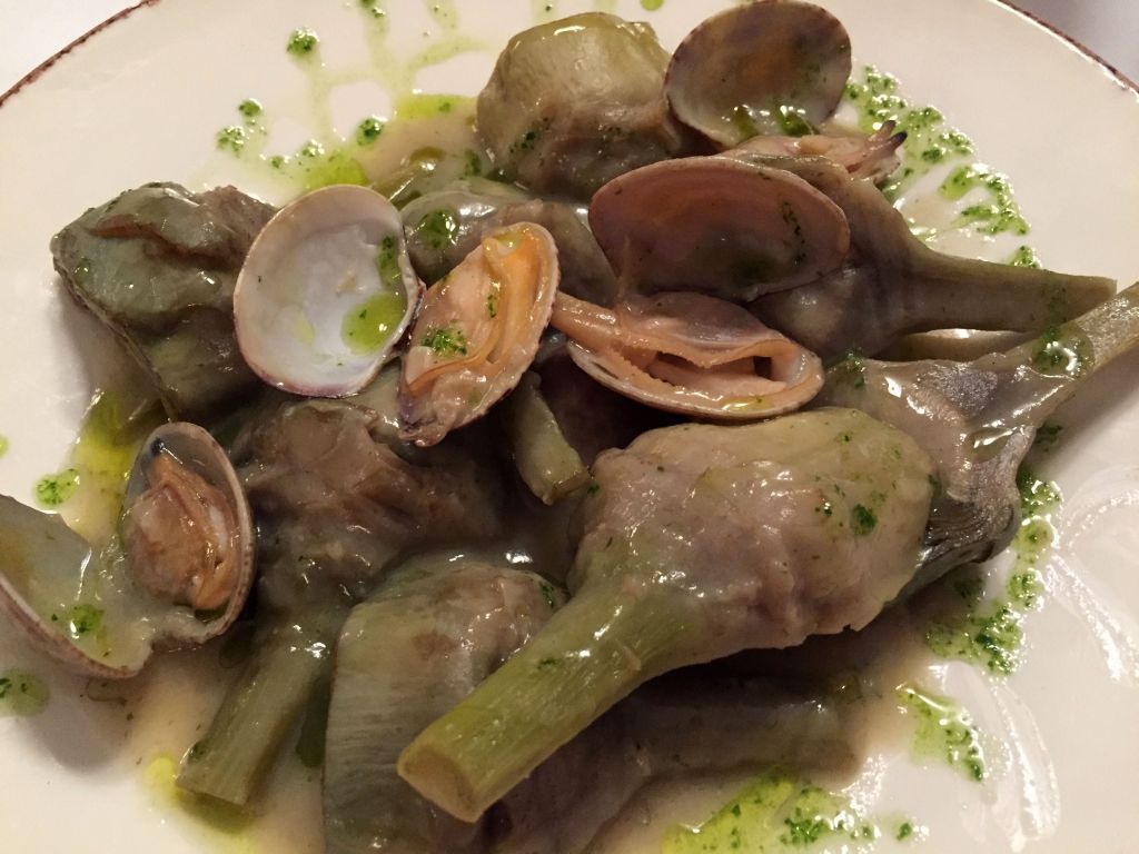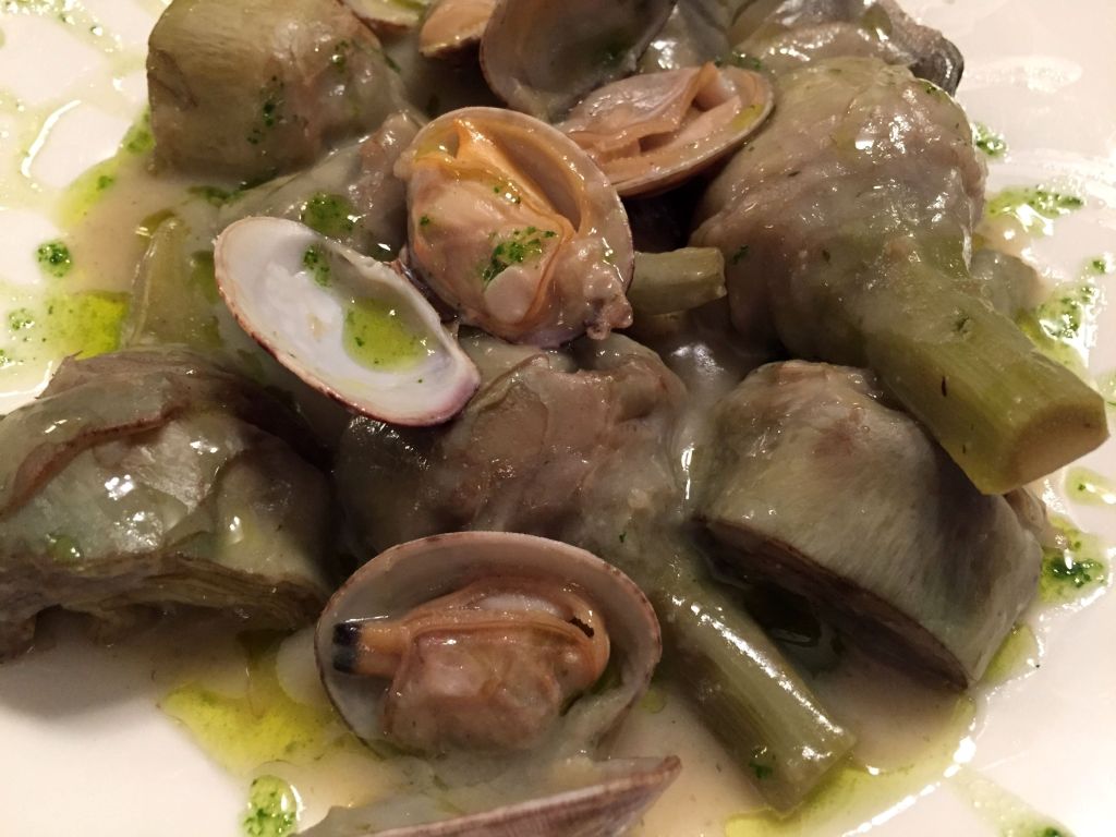 En la pizarra del escaparate anunciaban alcachofas en dos versiones, ¿por qué quedarse con una sola?. Las primeras con jamón y las segundas con almejas, SUPREMAS!!!!