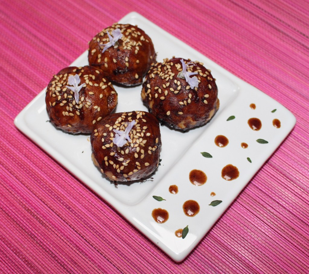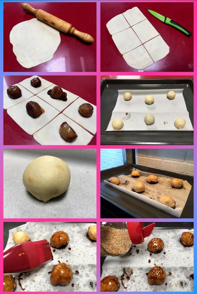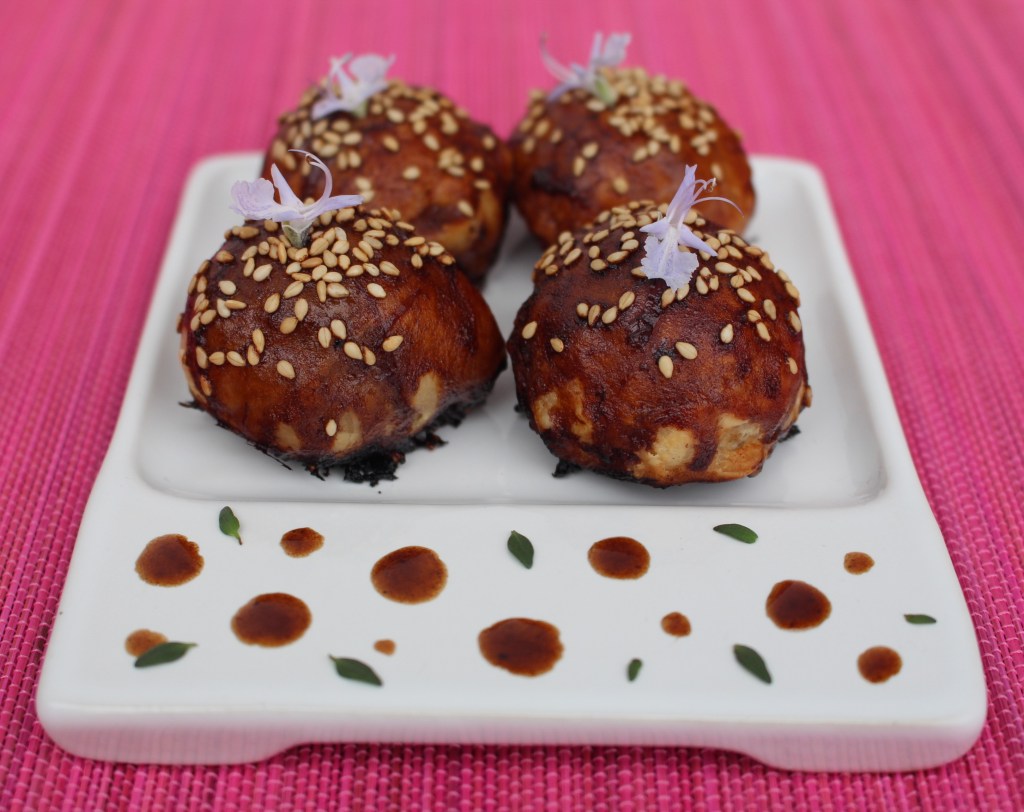 Colocamos las bolitas con las dobleces hacia abajo en una bandeja sobre la que hemos puesto un papel aceitado, introducimos en el horno durante 15 minutos. Cuando veamos que el hojaldre ha subido y se comienzan a dorar sacamos la bandeja y las pincelamos con el glaseado, espolvoreamos el sésamo y rematamos un par de minutos más en el horno.