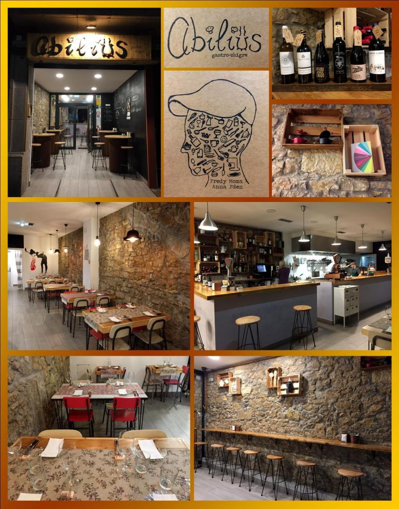 La antesala de Abilius destaca por una pared con pintura pizarra donde podemos ir tomando nota de sus propuestas y de paso tomarnos algo en unas mesas altas que huyen de los clásicos toneles. Ya en el interior prolongan esas mesas y una barra continua de taburetes altos que poco a poco se fue animando.