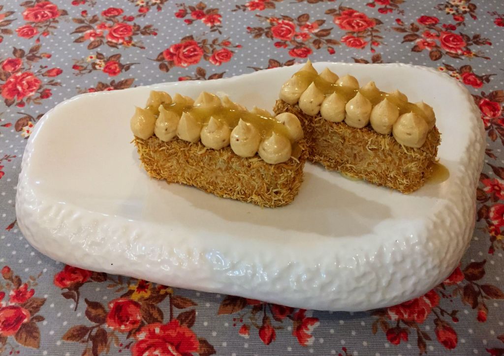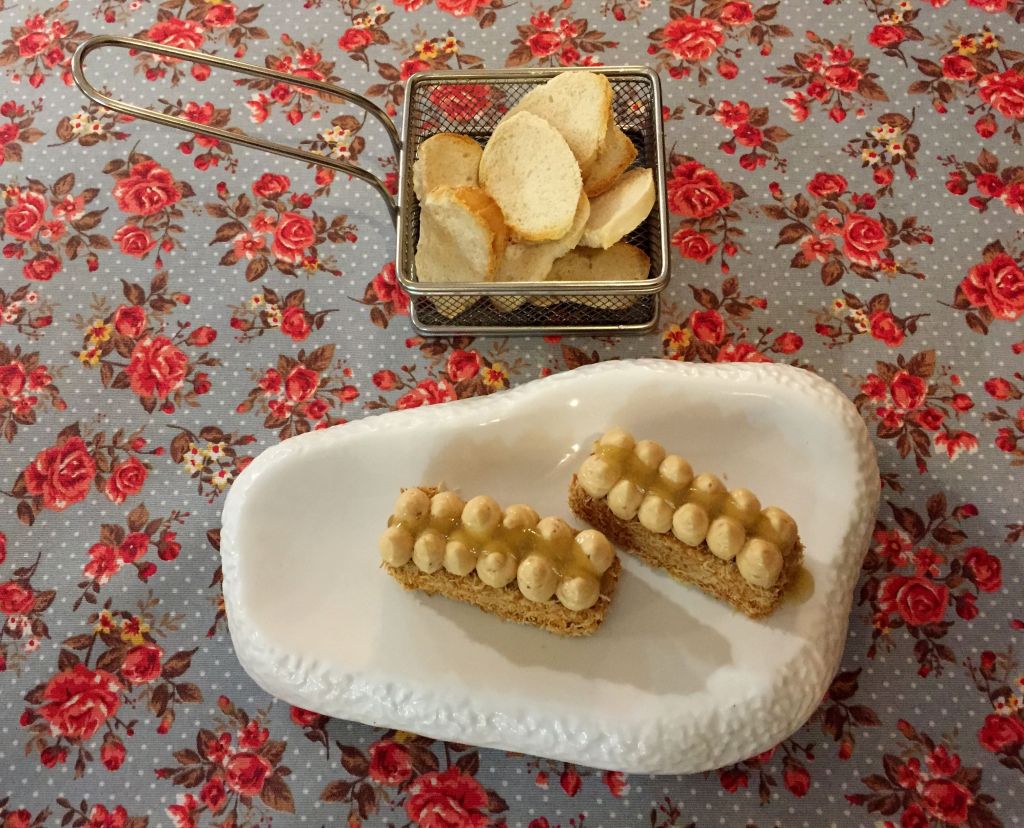 Comenzamos con una tarta de foie micuit, cataifi, mantequilla de turrón y confitura de lima. Una sabrosa y diferente forma de ofrecer un entrante clásico vistiéndolo con esta forma tan atractiva, que además aporta matices gustativos y texturas muy acertadas.