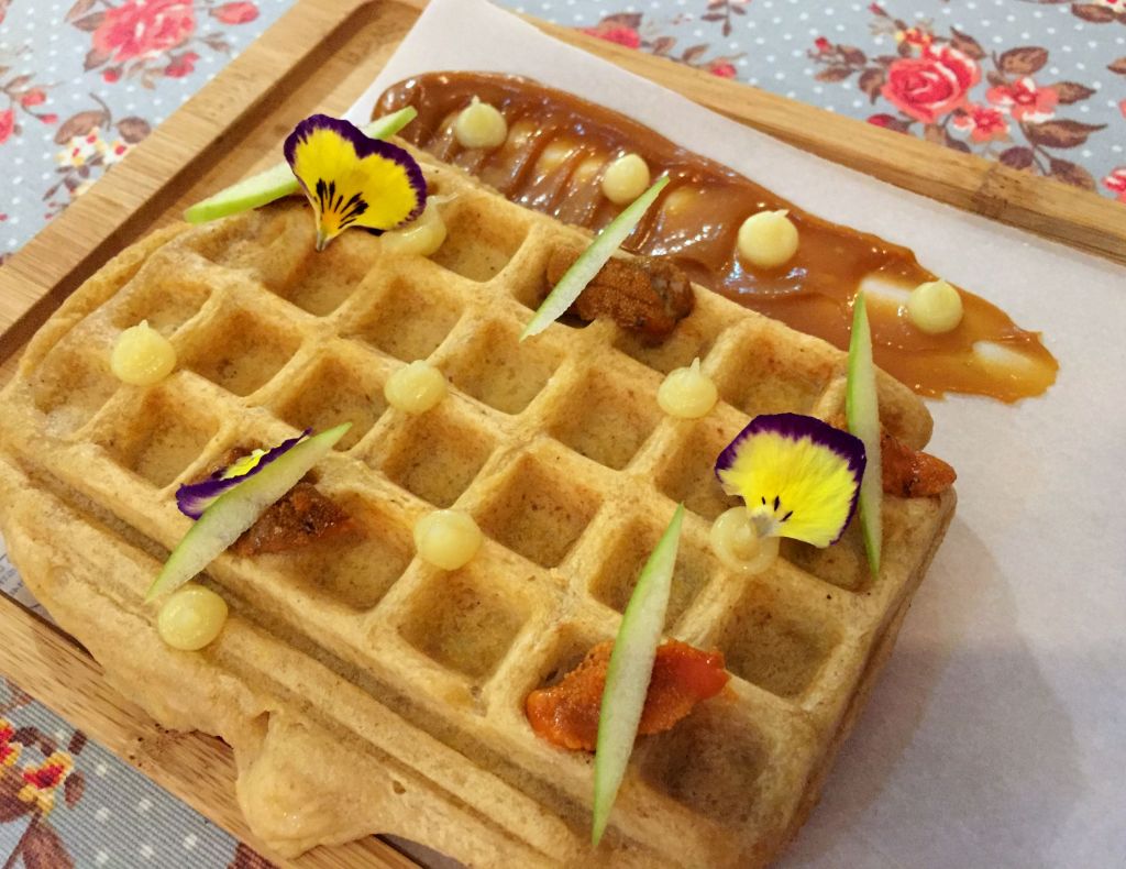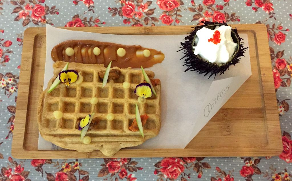 Siguiendo con los entrantes, que ellos llaman «Travesuras», probamos la versión maxi de su propuesta para el Campeonato de Pinchos de Asturias. Se trata de un Gofre de oricios «coco montado» y toffee de miso y azafrán.