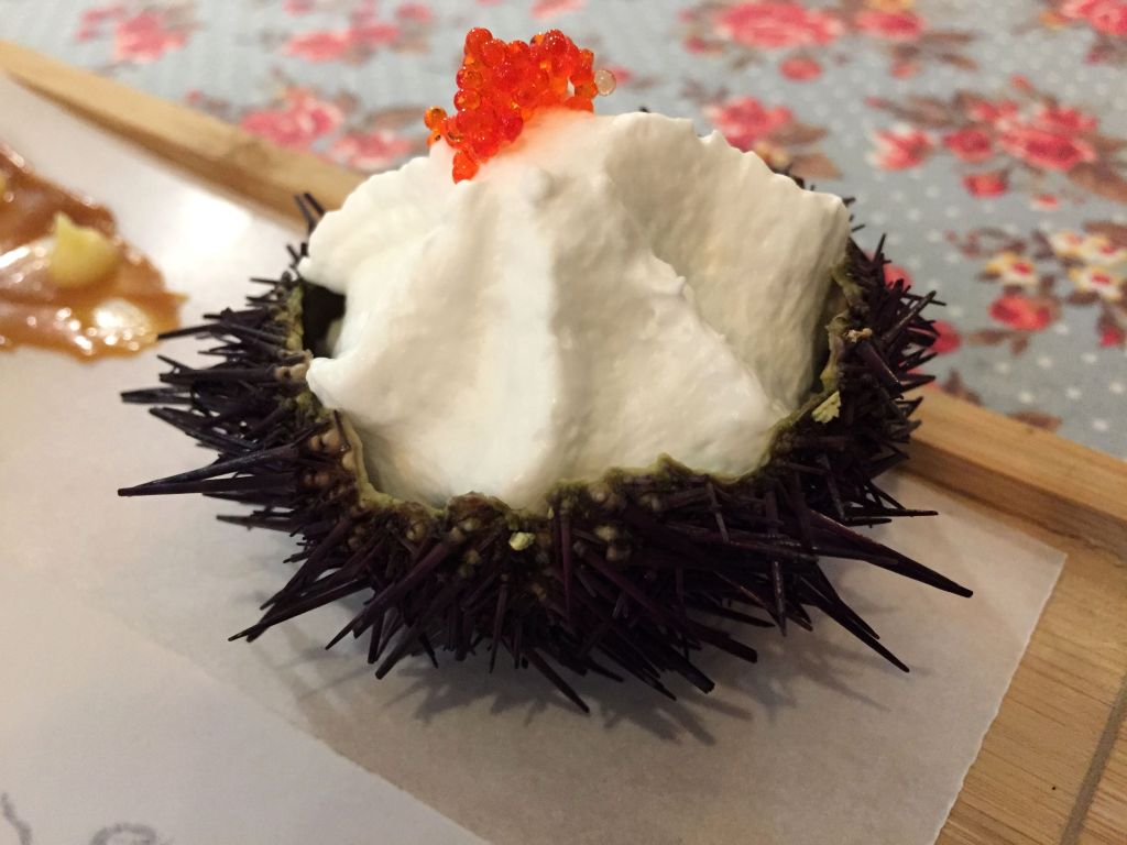 El gofre está hecho con oricios y a su vez se adorna con ellos. Se acompaña con el caparazón relleno con la espuma de coco y ese toffee tan original. Un conjunto quizás muy arriesgado para los gustos de la mayoría, esas mezclas de salado-dulce y encima con ingredientes tan poco usados en nuestra gastronomía como el miso y el coco, pueden provocar rechazo, no es mi caso.