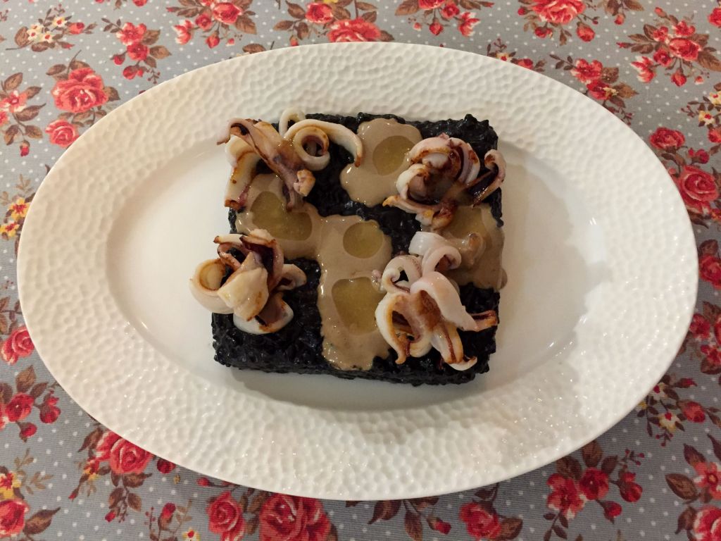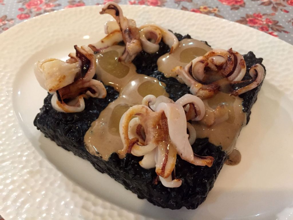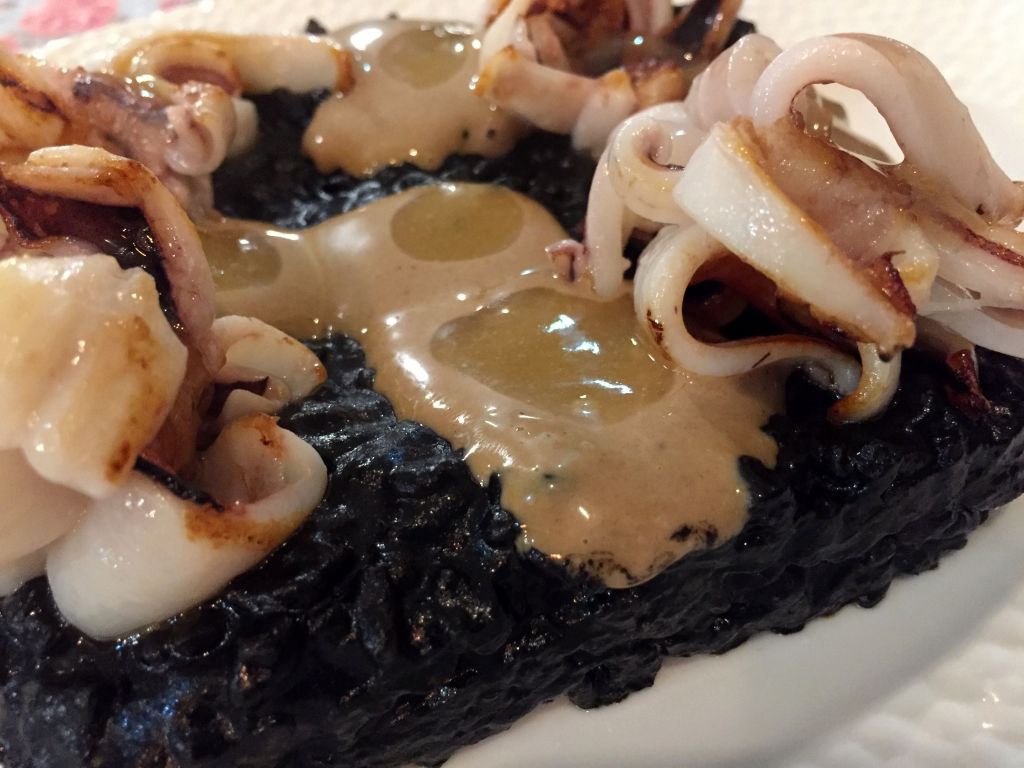 Nos ponemos serios con el arroz negro con fardos de chipirón y alioli de ajo negro. Fantástico, potente, buen punto del arroz, mucho sabor.