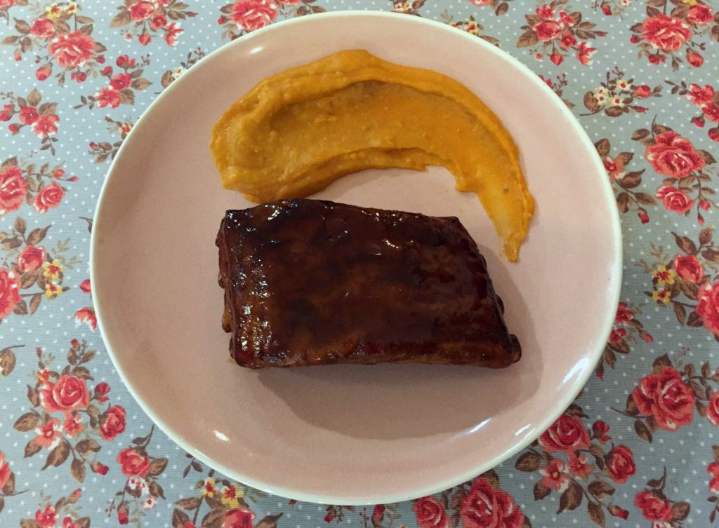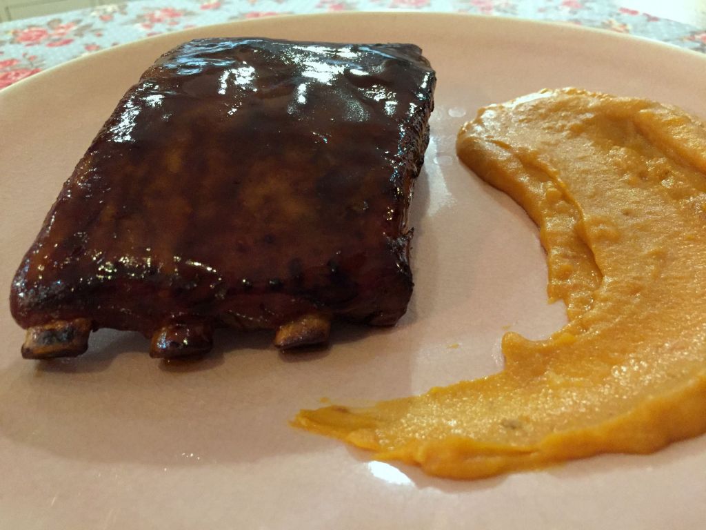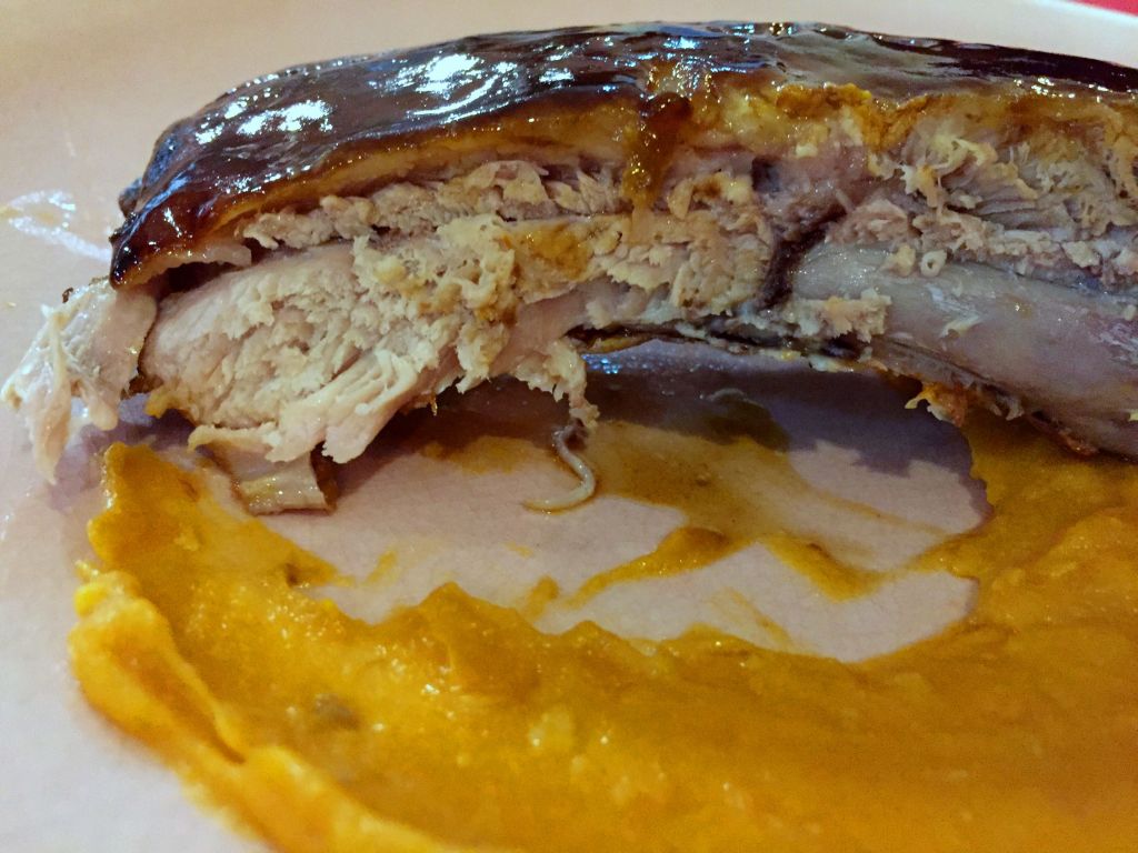 Turno de la carne, unas costillas de gochu lacadas que se acompañan de unas patatas revolconas. Muy sabrosas, una más no hubiese venido nada mal porque el hueso abulta y al final uno necesita más carne.
