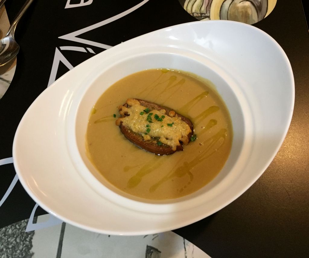 Crema de legumbres con costrón de pan de ajo y parmesano.