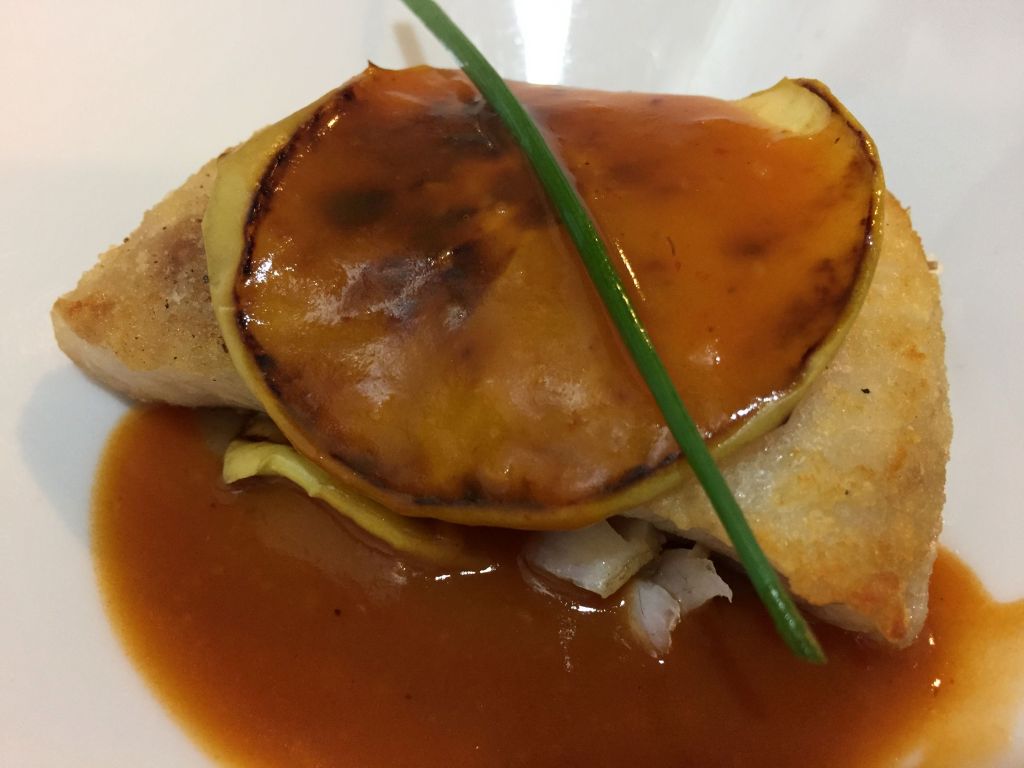 Montadito de merluza del pincho con manzana y crema de sidra.