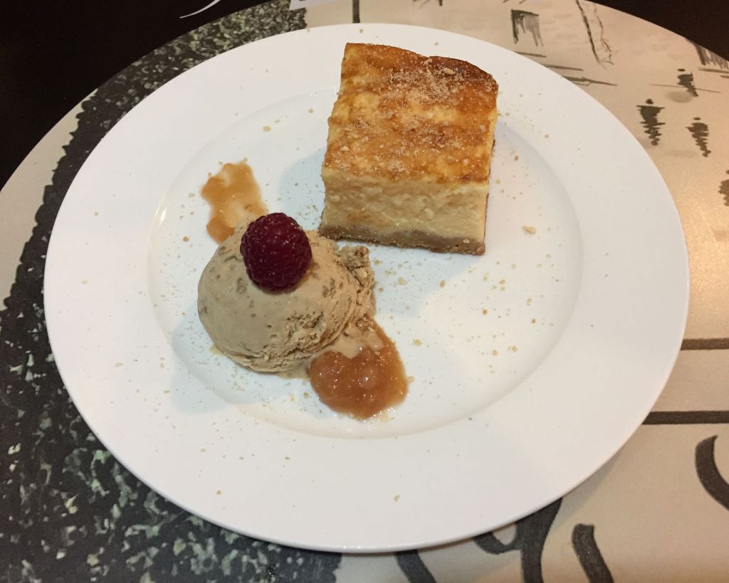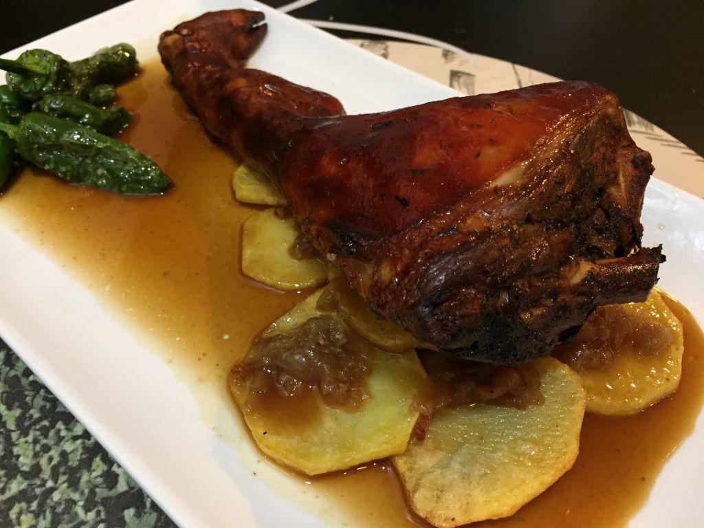 Otro de mis caprichos fue la pierna de cochinillo confitada a baja temperatura y su guarnición de patata a lo pobre. Estaba muy buena de sabor pero algo pasada, no tenía ese crujiente que uno busca en el cochinillo, algo que debía intuir cuando la pedí.