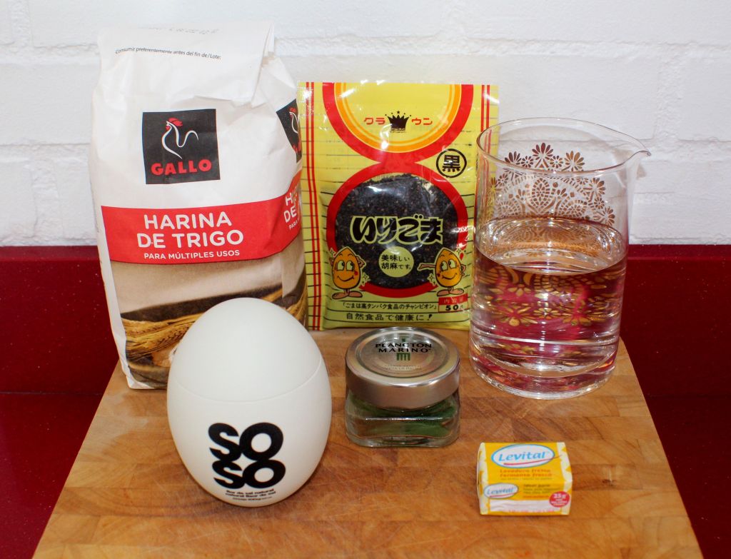 400grs de harina de trigo, 250ml de agua, 8grs de levadura fresca, 3grs de Plancton Marino, 6grs de sal y sésamo negro (se me olvido ponerlo 😦 )