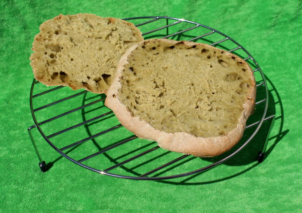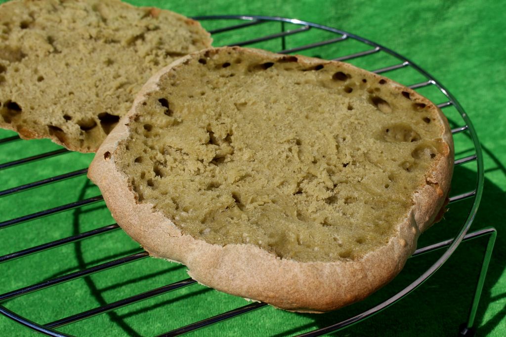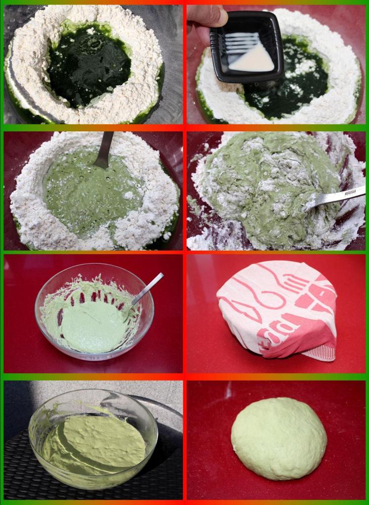 Al ver un pan negro de tinta de calamar inmediatamente me saltó la chispa y probé con este, que no ha quedado tan verde como me lo imaginaba. Habrá que repetirlo y jugar con proporciones diferentes.