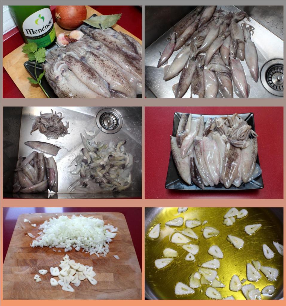 Primeramente limpiaremos los chipirones, para mi, es la parte clave de la receta porque comerse uno y encontrar «el plástico» (pluma), resulta muy desagradable. Retiramos la cabeza con cuidado, saldrán todas las entrañas, repasamos debajo del grifo introduciendo el dedo para que el cuerpo quede totalmente limpio. No retiréis la telilla exterior, le aporta color y sabor.