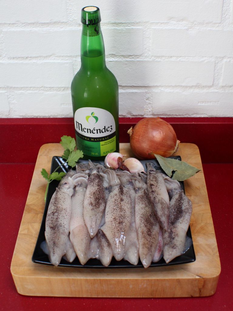 1kg de chipirones, 1 cebolla, 2 dientes de ajo, 2 guindillas cayenas, 1 hoja de laurel, 1/2 vaso de sidra natural de manzana, AOVE, sal y perejil.