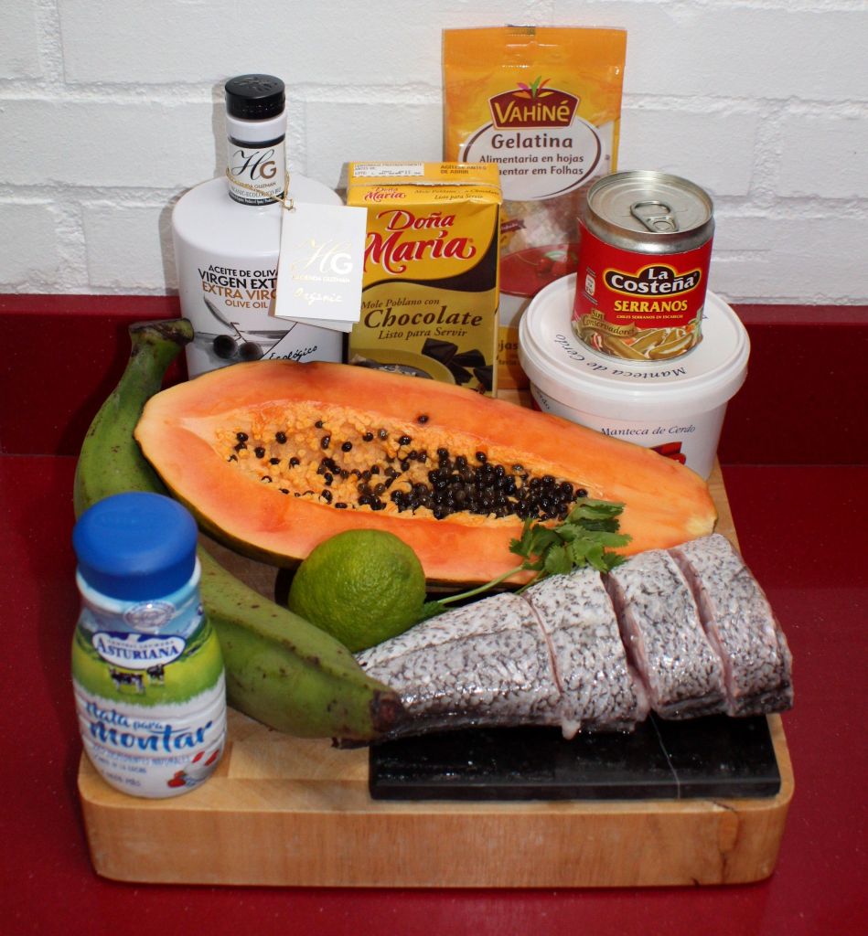 500grs de merluza, 1/2 papayon, 1 lata de chiles serranos, 1 manojo de cilantro, 1 lima, mole poblano con chocolate, 200ml de nata 35% M.G., 2 hojas de gelatina, 1 cucharada de azúcar moreno, 1 plátano macho, 1 nuez de manteca de cerdo, 100ml de agua, 2 ramas de tomillo fresco, sal y AOVE.