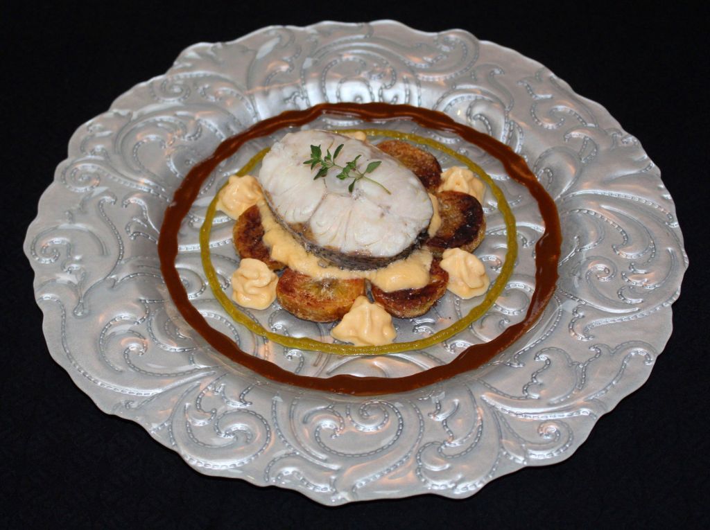 Sacamos la merluza y la dejamos reposar un par de minutos para que suelte agua y no nos arruine la espuma al estar muy caliente. Ponemos unos puntos de espuma y colocamos una pieza de merluza sobre la que habremos echado unas gotas de AOVE. En los huecos que nos queden aplicamos otros puntos de espuma de papaya, rematamos con una ramita de tomillo y ya tenemos lista nuestra merluza caribeña.