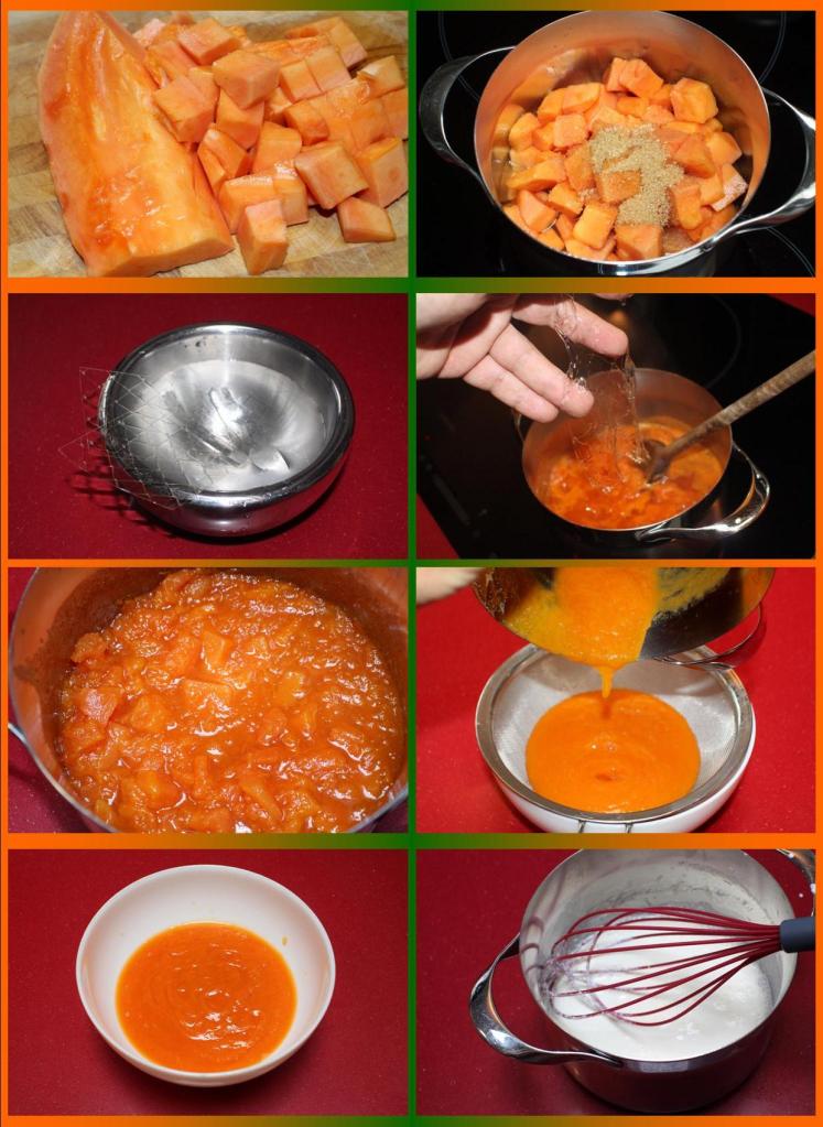 Despepitamos y pelamos la papaya, cortamos en cuadrados e introducimos en una cacerola con 100ml de agua y una cucharada de azúcar moreno. Llevamos a hervor y dejamos que ablande durante unos 10 minutos, hidratamos las hojas de gelatina en agua fría y añadimos a la compota, removemos y transcurridos un par de minutos, retiramos, trituramos y colamos con un colador de malla fina. Reservamos.