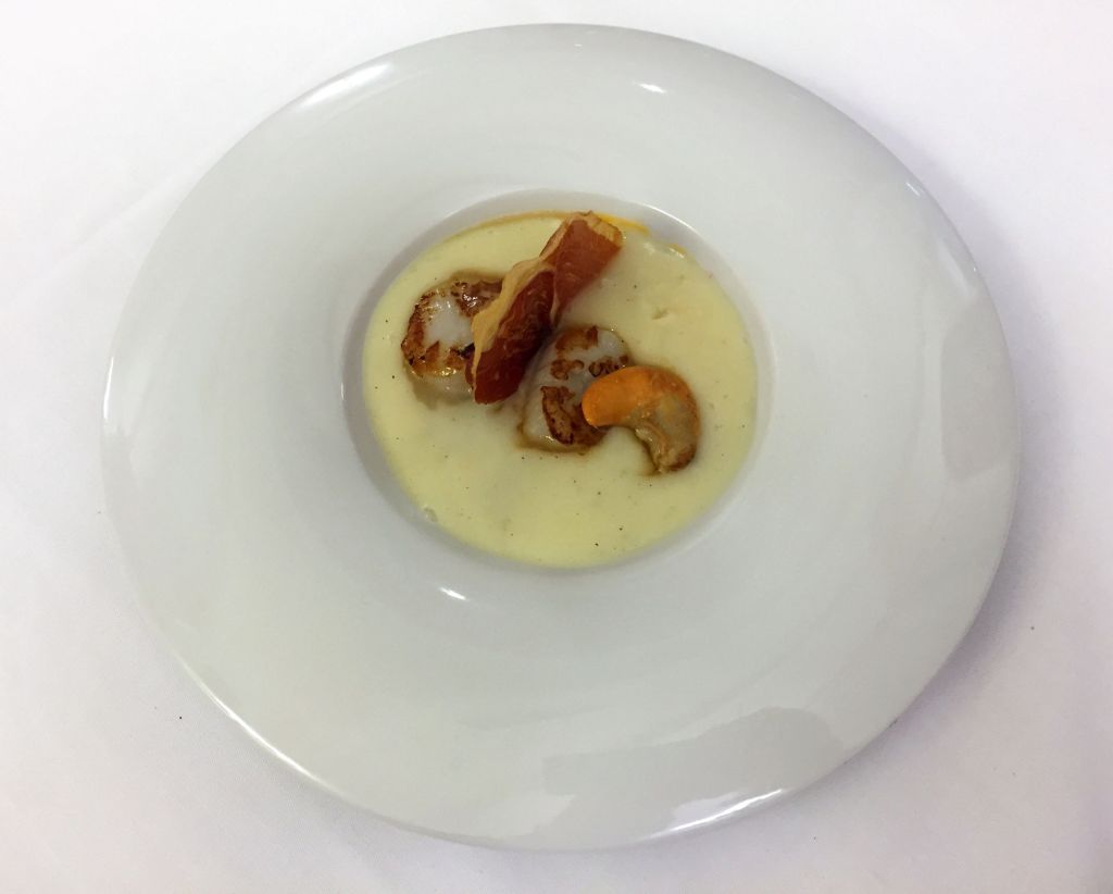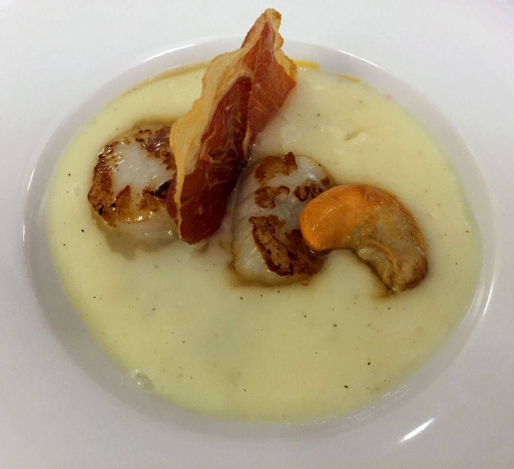 Y otra versión sobre un parmentier de patata y crujiente de jamón.