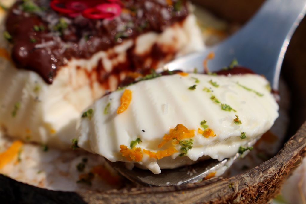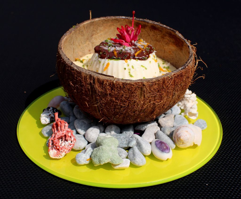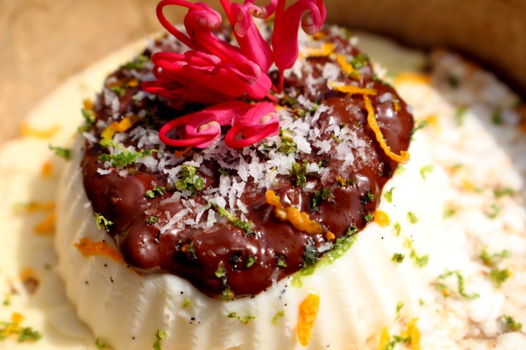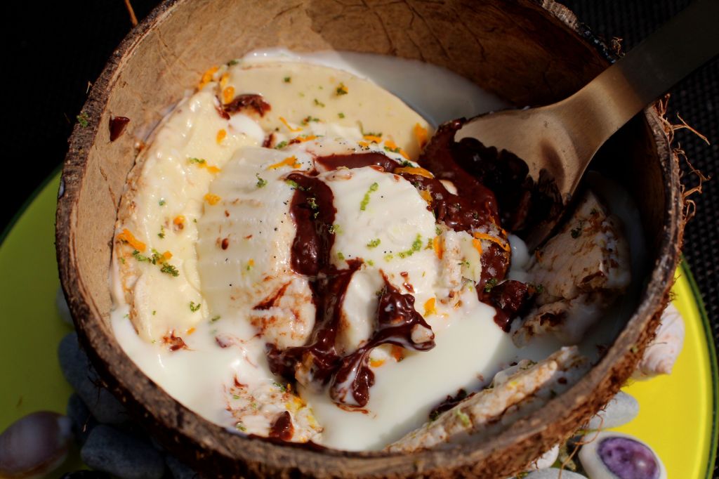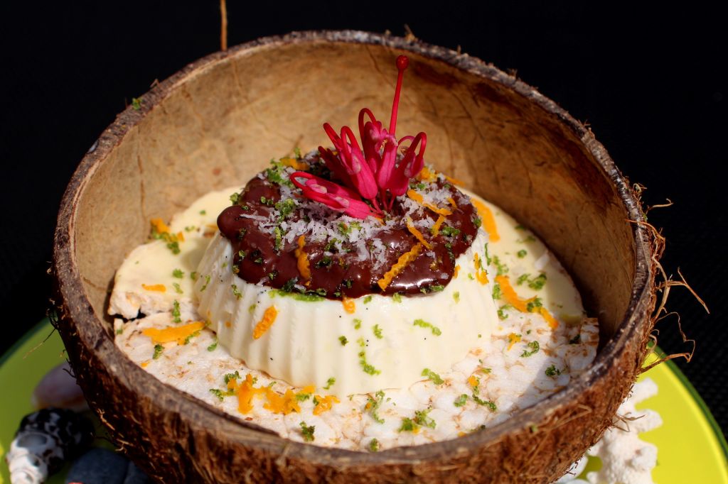 Cortamos la tortita a la mitad para mostrar ambas caras, la del arroz y la del chocolate blanco. Removemos muy bien el yogur para darle cremosidad, rallamos naranja y lima, cubrimos con la tortita. Sobre ella colocamos la panna cotta. Ponemos unas onzas de chocolate en el microondas, una vez derretido removemos bien, ponemos encima de la panna cotta, volvemos a rallar nuestros cítricos y rematamos con un poco de coco rallado, una flor decorativa y a disfrutar.