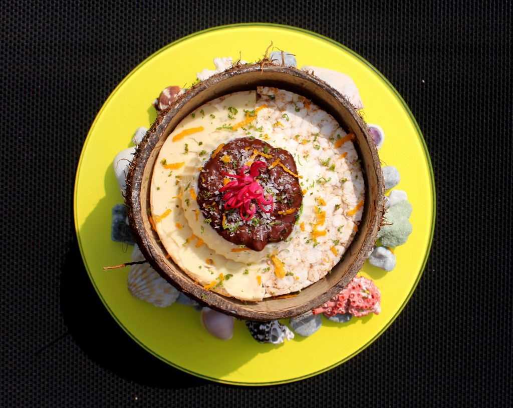 Además de una pensada conexión de sabores, jugamos con los lácteos de la panna cotta y los del yogur de lima y limón, la mezcla de chocolates blanco y negro que equilibran con su dulzor los cítricos; a nivel texturas aunamos la cremosidad, el crujiente de las tortitas de arroz y las almendras del chocolate, y el contraste de temperaturas.