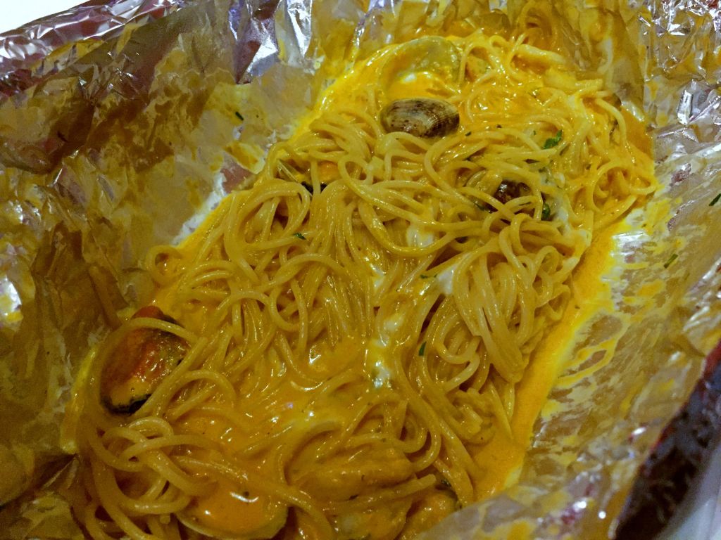 Spaghetti al Cartoccio: salsa de tomate, langostinos, nata, calamares, mejillones y almejas