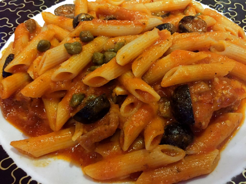 Pennette a la Putanesca: ajo, anchoas, alcaparras, berenjenas, olivas, vino blanco, guindilla y salsa de tomate.