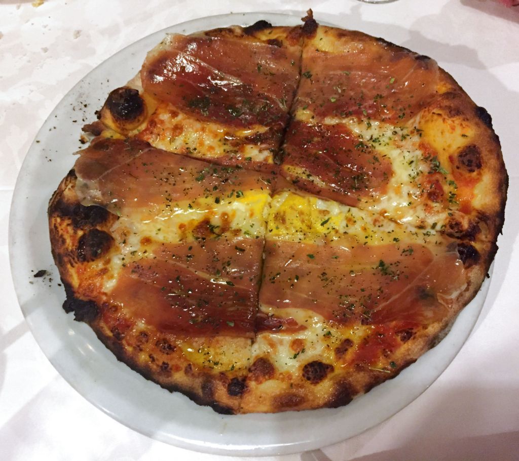 Prosciutto di Parma: tomate, mozzarella, huevo, jamón de Parma y orégano.