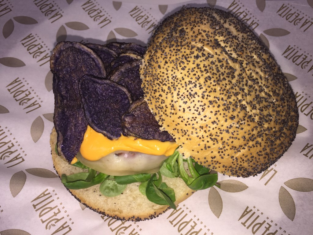 Comencemos por la más rara. Se trata de la hamburguesa del mes, y esta hecha ni más ni menos que con pulpo. La Pepita A Feira se compone de pulpo, queso de tetilla gratinado, emulsión de ajada, crujiente de patata violeta y canónigos. Sorprendente combinación pero he de deciros que estaba de muerte.