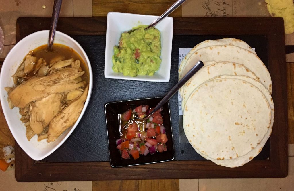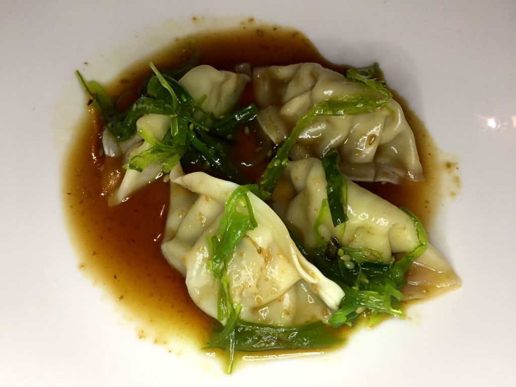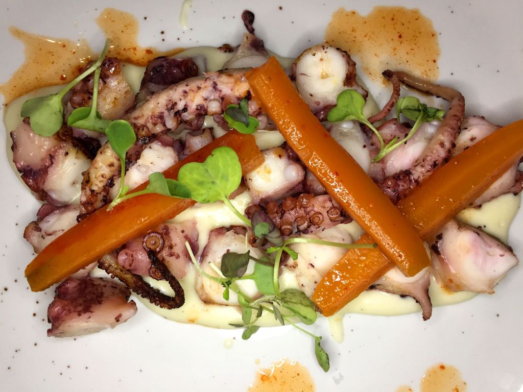 Al ser unos cuantos optamos por un menú concertado de platos al centro para compartir compuesto por unas sabrosas gyozas; jamón ibérico con tumaca y tostas crujientes; langostinos crujientes con mayonesa de fruta de la pasión; unos deliciosos roll de salmón y anguila ahumada; pulpo, patata y zanahoria al kimchi; tacos de pitu con guacamole y pico de gallo y de postre una tarta de queso deconstruida.