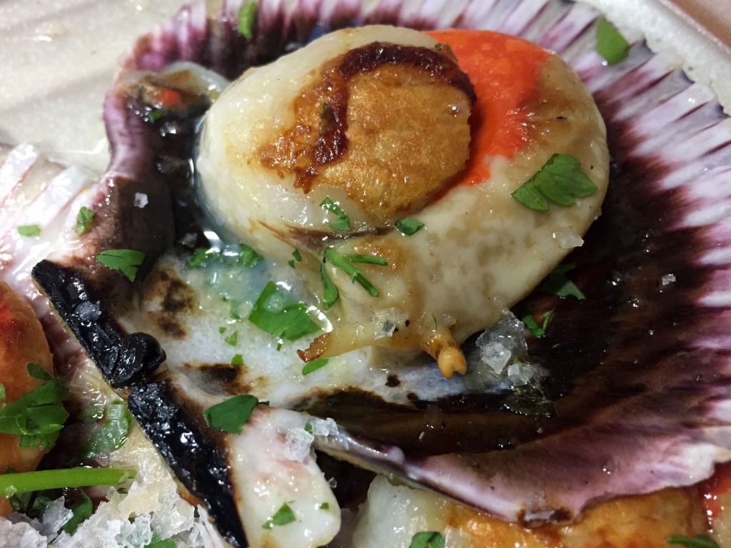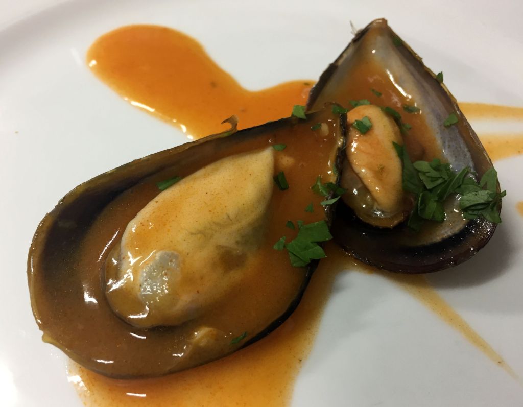Comenzamos con unos fabulosos mejillones en salsa picantes, una espectacular docena de zamburiñas con un tamaño considerable y unas parrochas algo pasadas de tamaño.