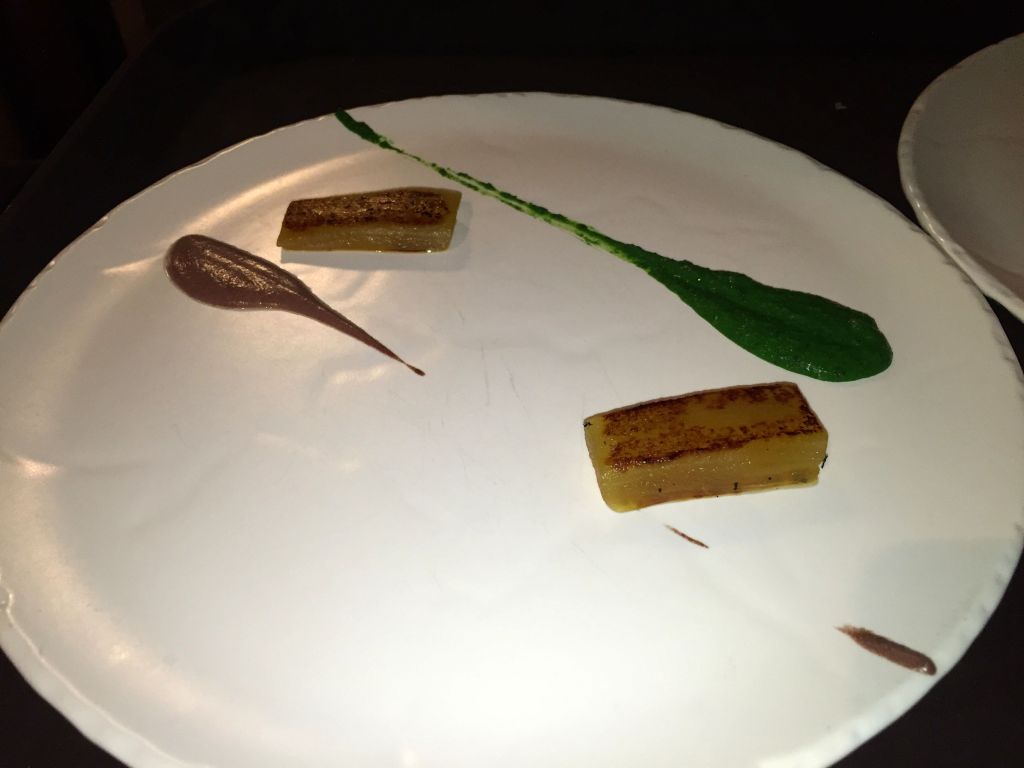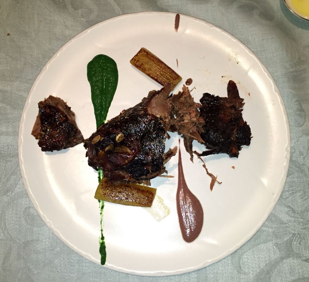 Rematamos con el esperpento de la noche, el pato azulón a la brasa con cuscús y berenjena a la miel. Quiero dejar constancia de que el plato en si es excelente, sabrosísimo, de altísima calidad en materia prima y elaboración pero en vez de vendernos tanto las excelencias de esta ave, el camarero debería haber empleado ese tiempo en acudir a un curso de trinchado.