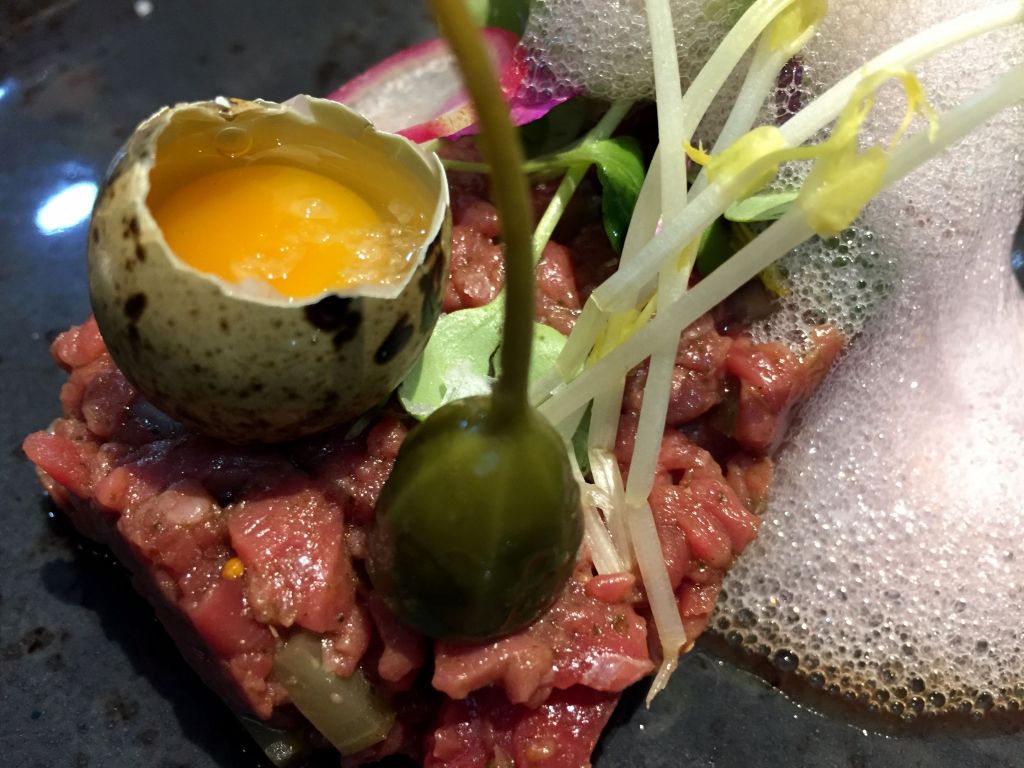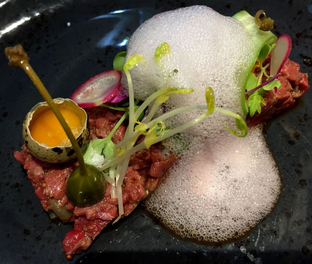 La carne esta recién picada a cuchillo (como debe ser), incluye alcaparrones y complementa la cebolla picada con un aire de cebolla y un huevo de codorniz crudo que habremos de mezclar nosotros mismos. Resultó muy equilibrado y encima su estética está muy trabajada alejándolo de presentaciones más tradicionales (aburridas).