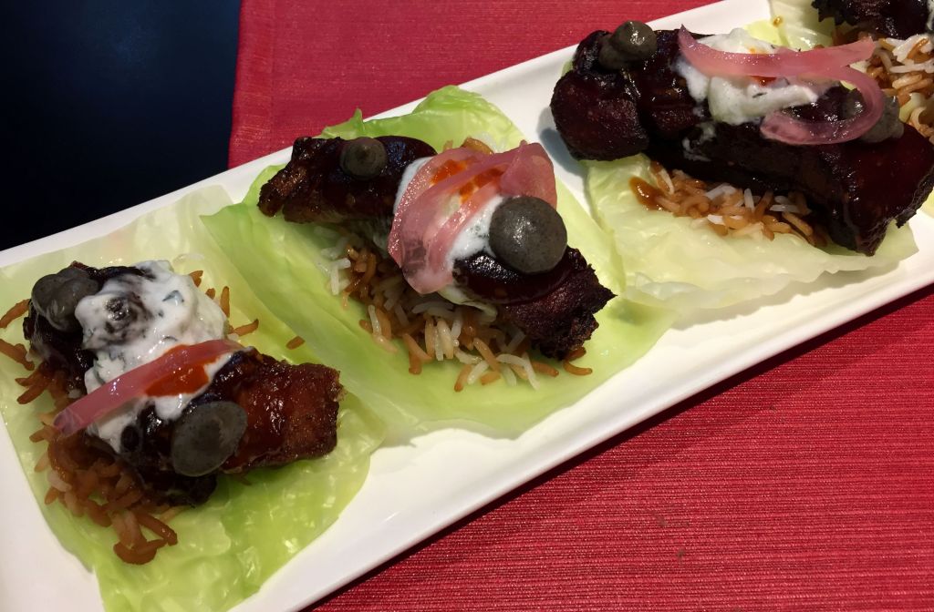 La costilla deshuesada se coloca sobre un poco de arroz variado y se termina con una salsa griega de tzatziki (yogur y pepino como ingredientes principales) y otra de berenjenas ahumadas. Son adictivos y para los amantes del finger food son la excusa perfecta para sacar nuestros instintos básicos, pringarnos y disfrutar como enanos.