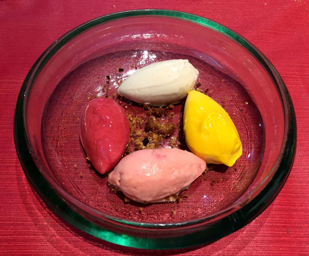 Para rematar la comida elegimos un variado de helados caseros, todos muy cremosos. Las quenelle de frambuesa, naranja sanguina, mango y plátano se colocan sobre un crumble.