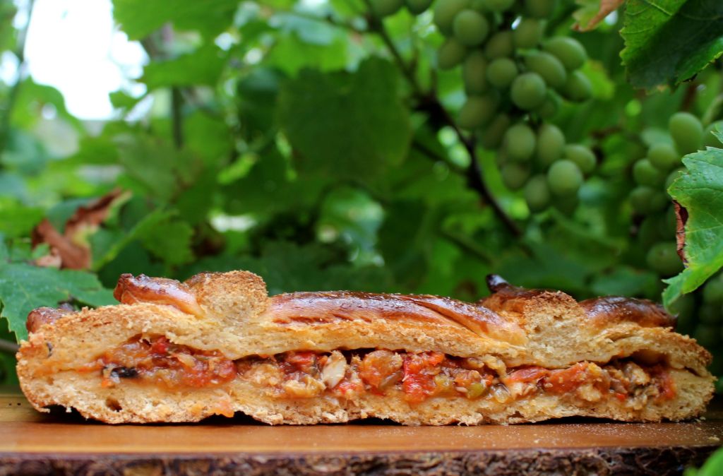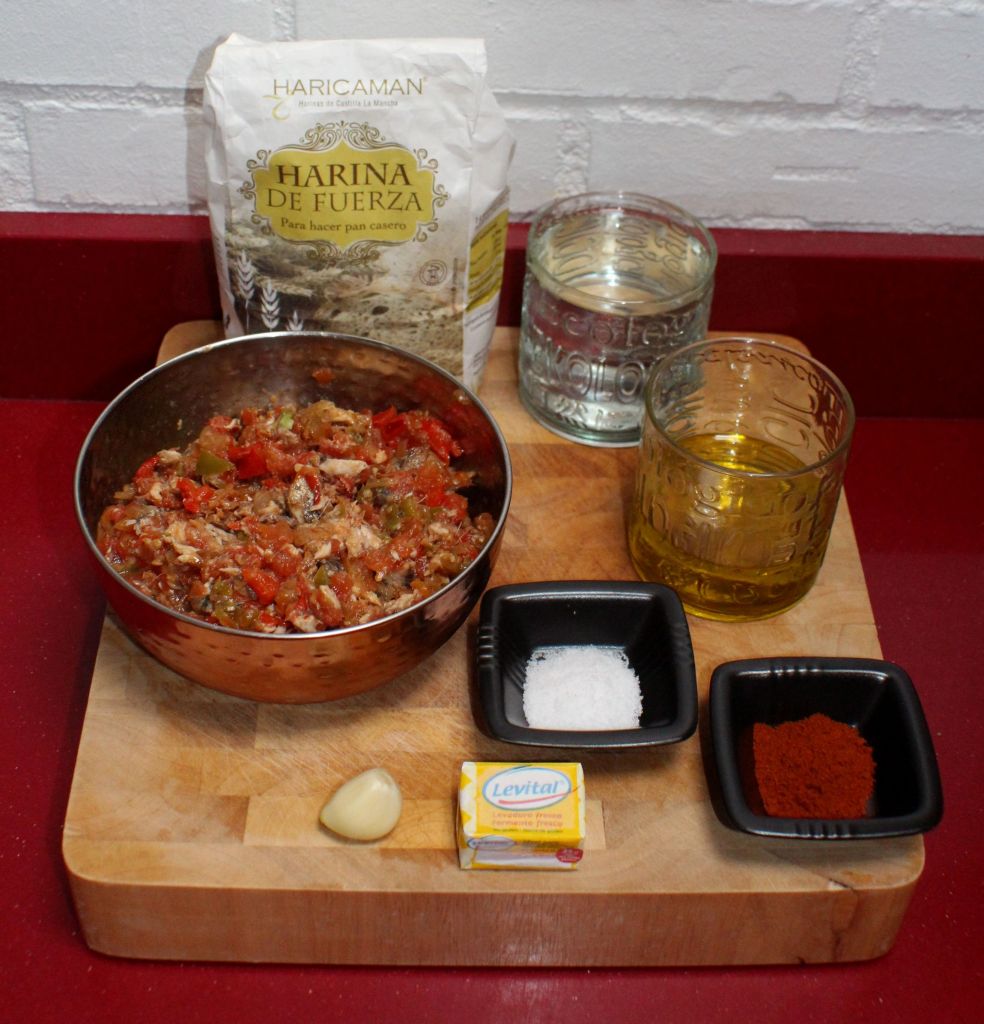 Para la Masa: 500grs de harina de fuerza, 200ml de agua tibia, 100ml de aceite sofrito, 1 ajo, 1 cucharadita de pimentón dulce, 1 cucharadita de sal, y 10grs de levadura fresca.